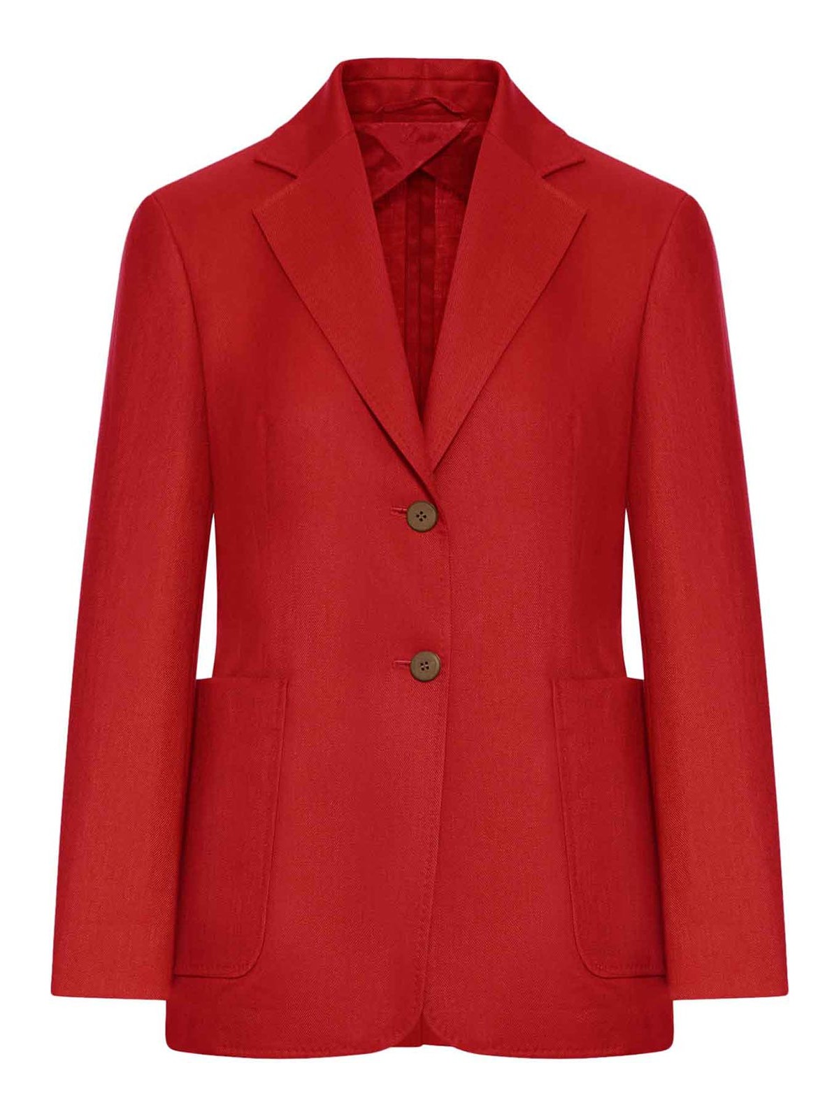 notch lapel, two-button front closure, slightly tailored waist, long sleeves, front patch pockets, center back seam, fitted construction, straight hem, color: rosso