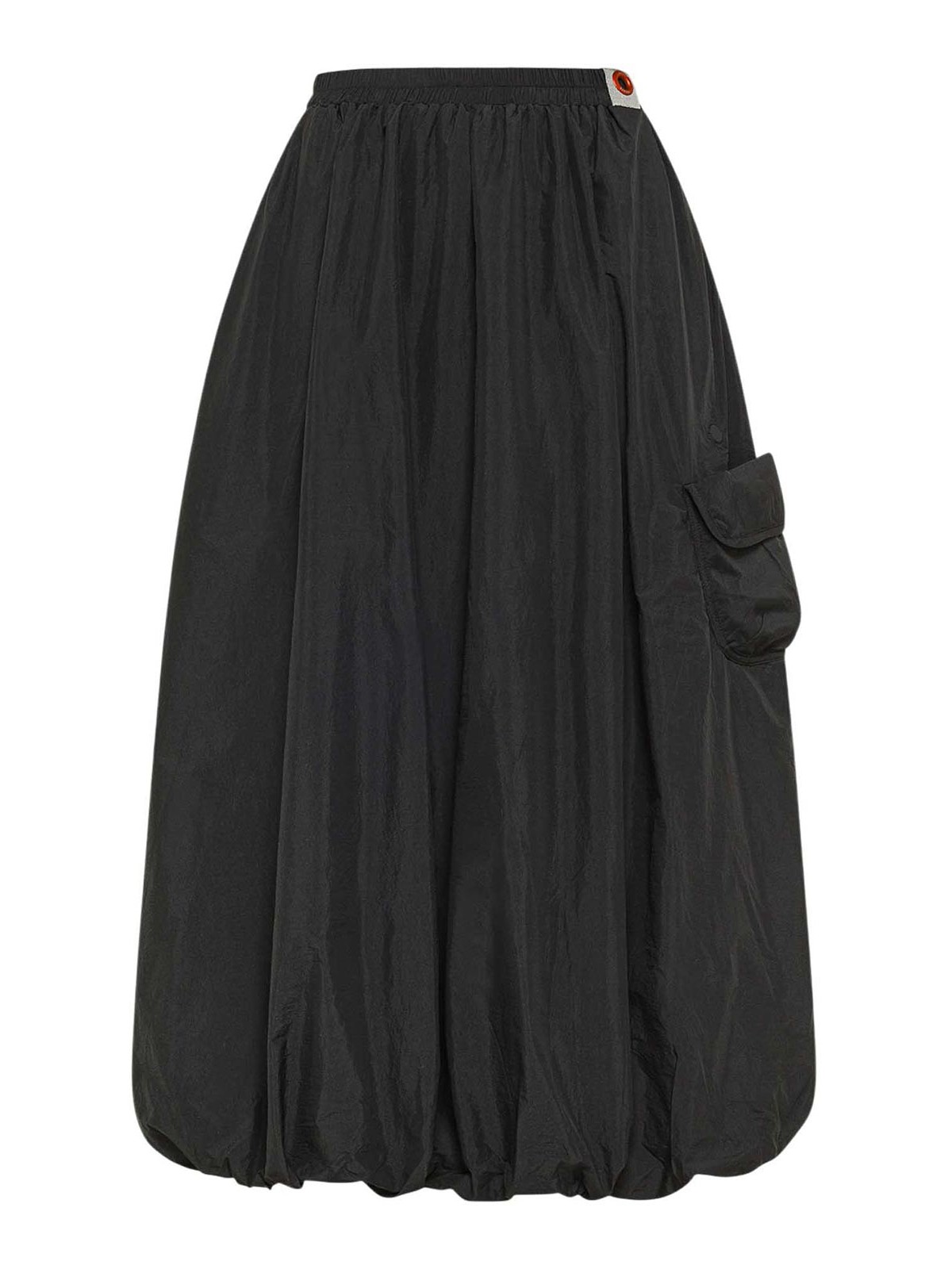 Dekker skipjack maxi skirt in super light nylon / black maxi skirt with a technical and contemporary character, made of super light 20 denier nylon with semi-matte finish. the fabric combines extreme lightness and resistance, while the water repellent treatment offers protection from humidity and light rain. the wide and slightly flared silhouette can be modulated thanks to the adjustable drawstring at the bottom, which transforms the line into a more compact and dynamic balloon shape. the design is completed by a side pocket with flap and magnetic closure, applied patch and crotchet at the waist with metal porthole, an iconic Dekker element. a versatile and transformable garment that combines performance, functionality and urban style. fit: regular main fabric: 100% polyamide padding: 100% polyester details: side pocket with flap and magnetic button, crotchet at the waist with metal porthole adjustable bottom with drawstring properties: water repellent mood: informal