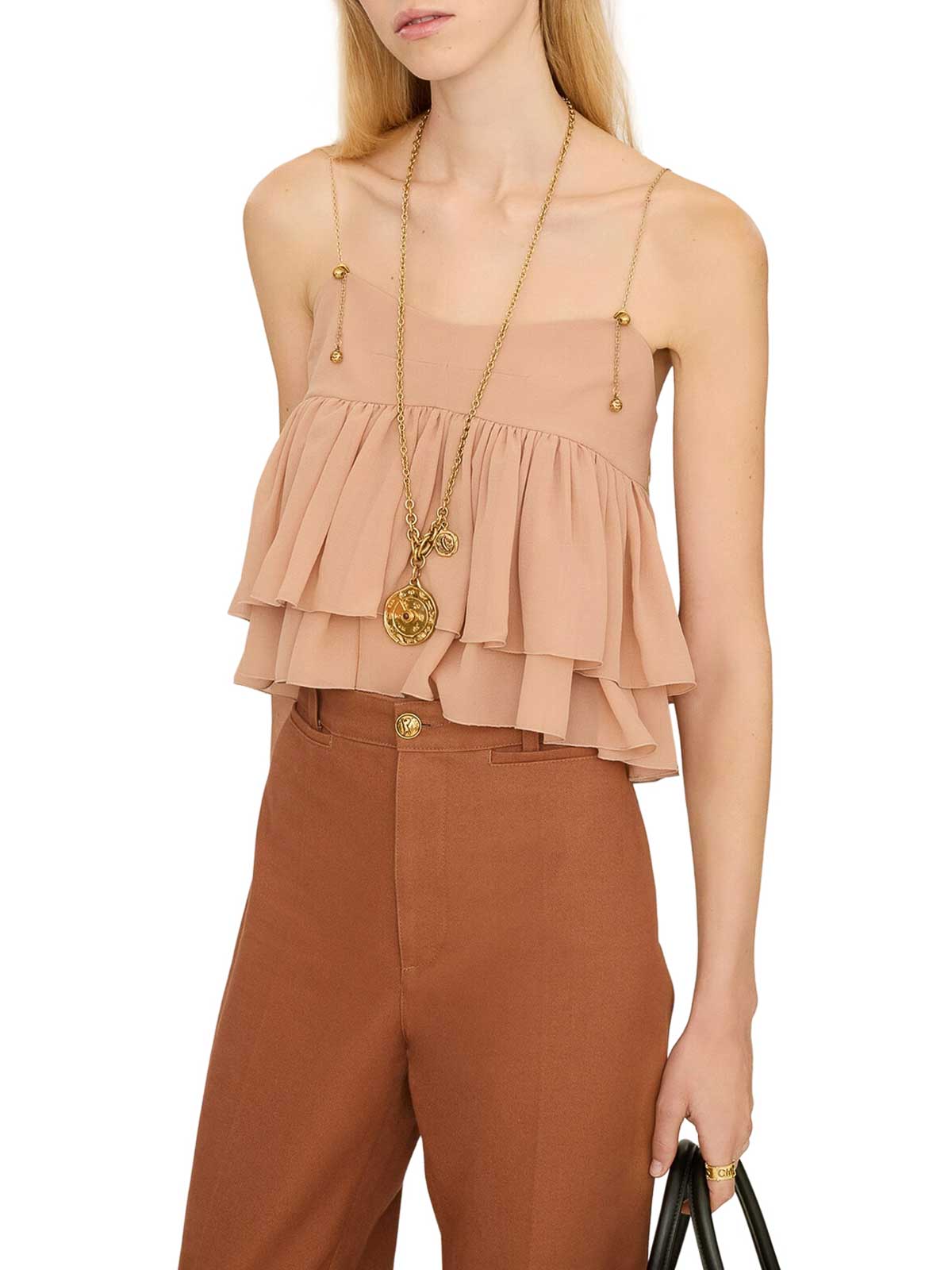 Sleeveless silk georgette top with ruffles, adjustable thin chain shoulder straps with c detail, silk top, sleeveless, fabric-covered buttons on the back, fit: loose, the model is 178 cm tall and wears a size 36, color: pink