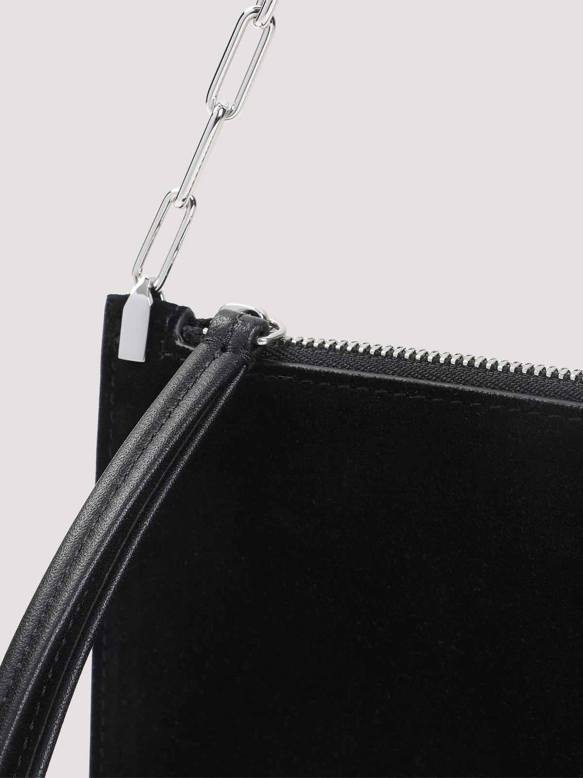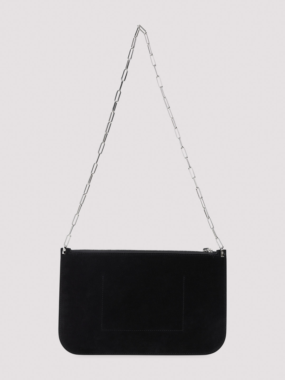 Phoebe philo black suede leather slip chain pouch. pure black suede leather pouch bag, top silver-tone metallic chain shoulder strap, top zipped fastening, one main compartment.