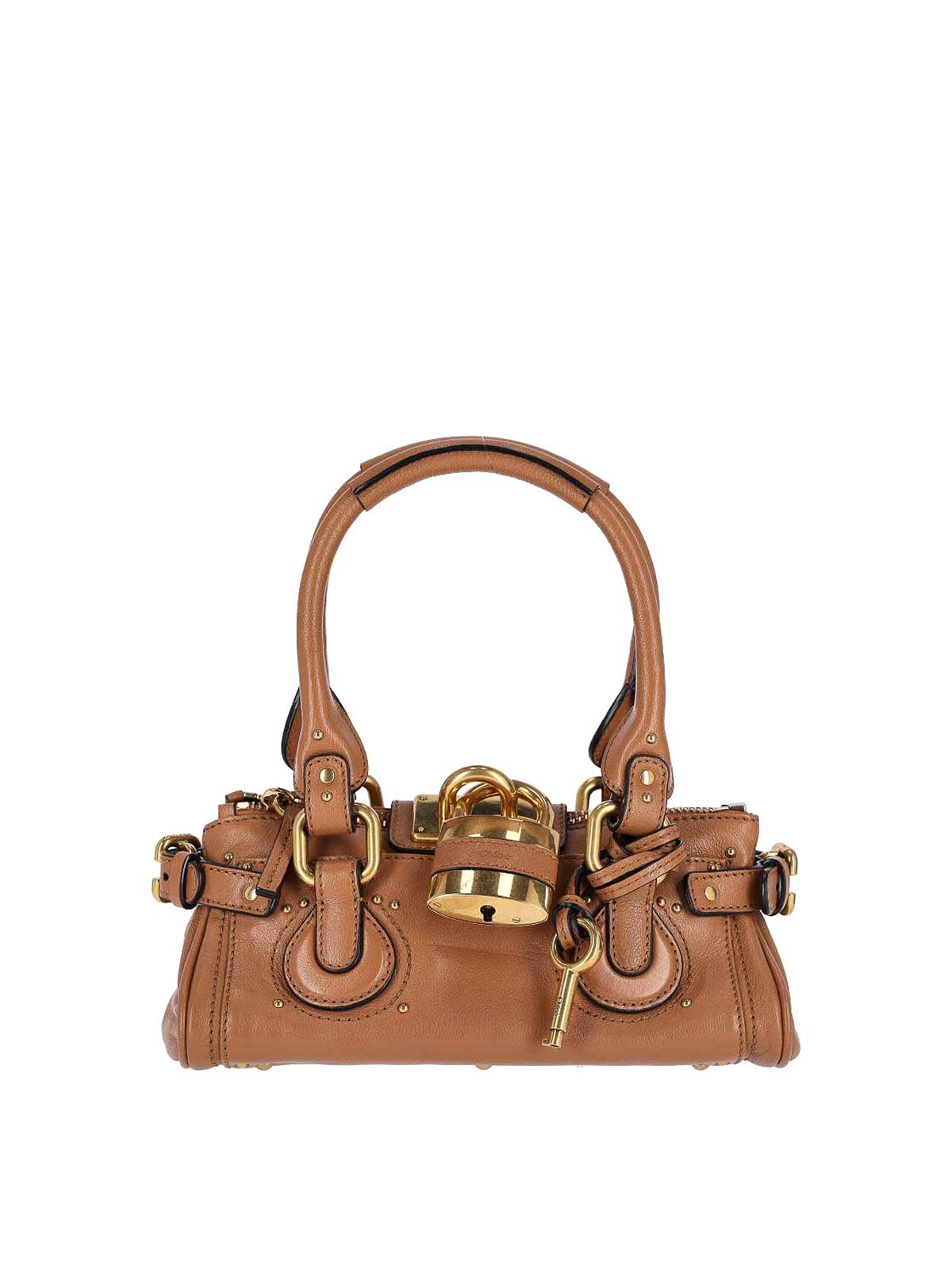 Small paddington chlo bag, in brown textured buffalo leather, two top handles, zip closure and golden padlock, leather logo on padlock, key charm detail, adjustable side golden metal buckles, all-over studs, one flat front pocket, one flat back pocket, one internal zip pocket, one main internal compartment.