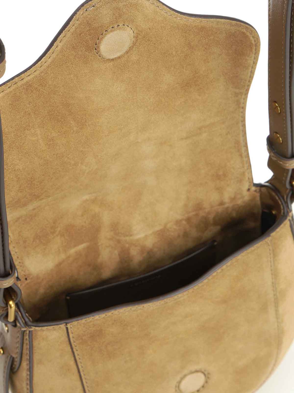 Suede shoulder bag can be carried by hand over the shoulder or across the body adjustable shoulder strap with mushroom buttons and loops flaps braided tongue with engraved isabel marant logo magnetic back patch pocket interior pocket with embossed isabel marant logo