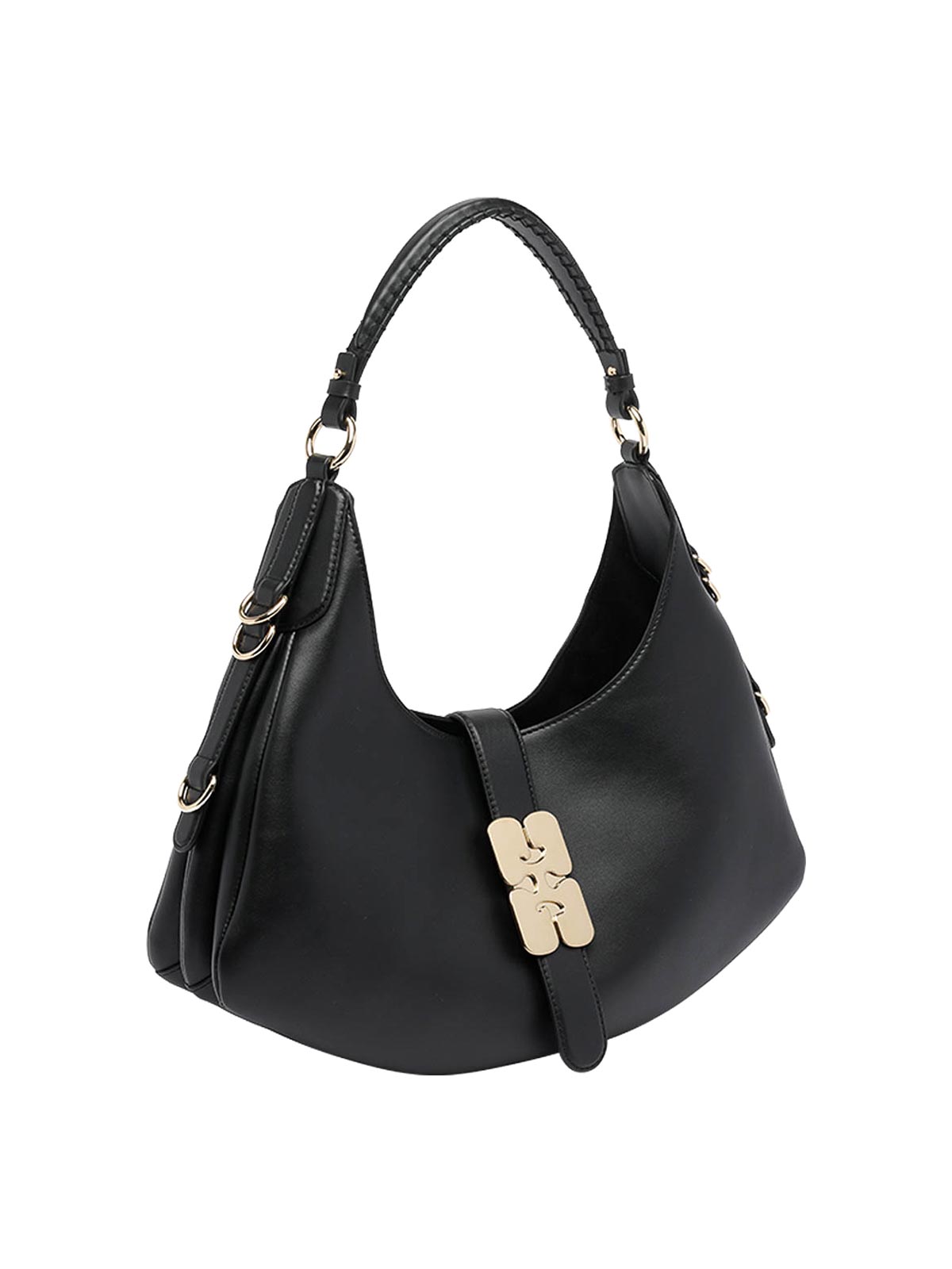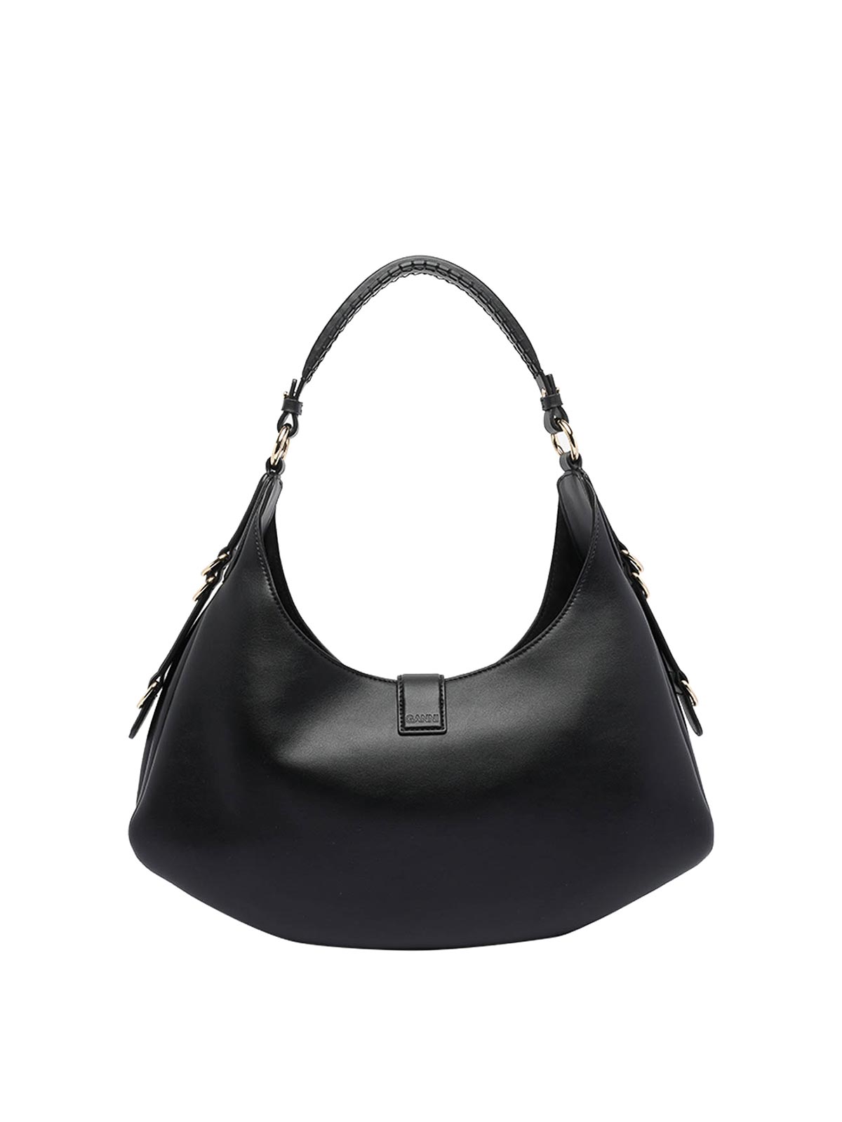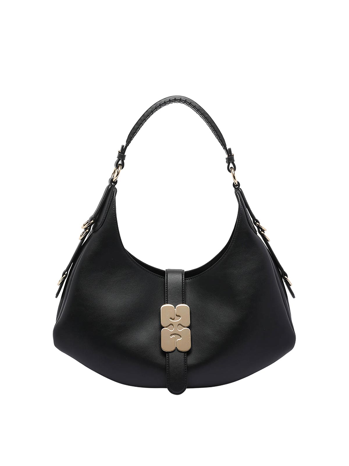 Ganni black small kat shoulder bag magnetic open pocket removable strap golden logo