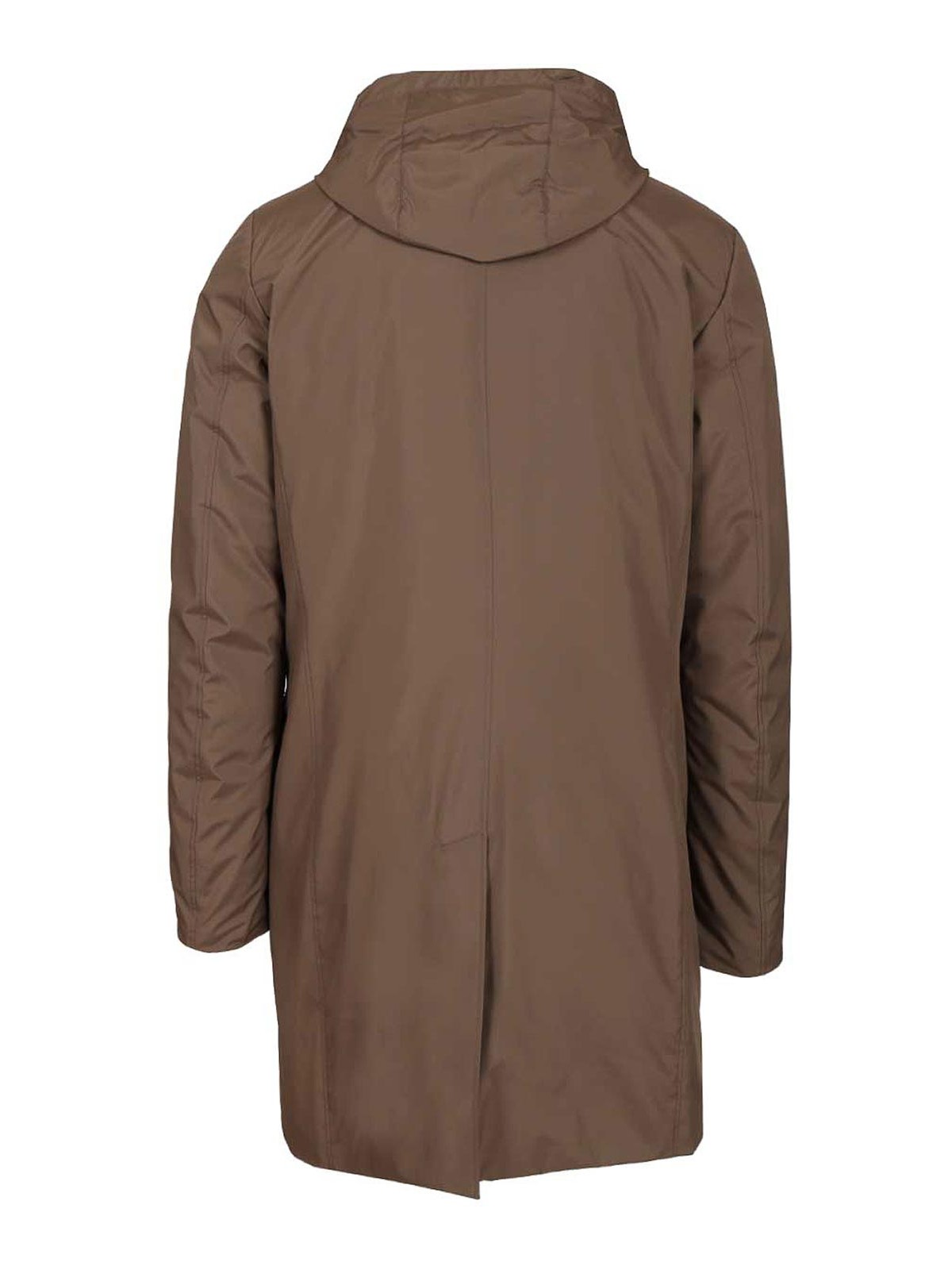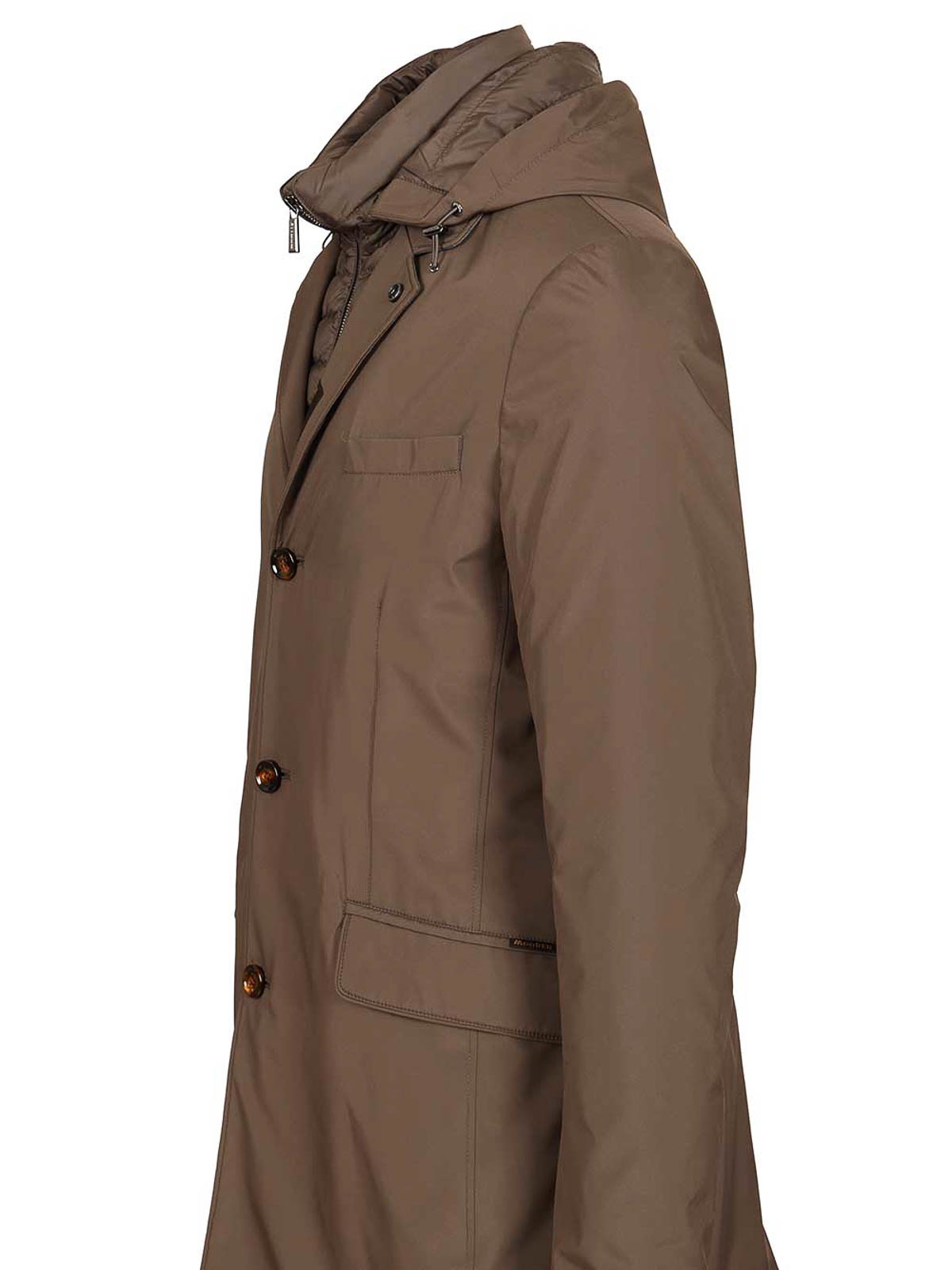Smooth coat by moorer, padded with goose down and made of super light, opaque, water-repellent and down-proof resin-coated technical fabric, with removable bodice with adjustable hood, boudin quilting, closed by metal zip, collar with notched lapels and press stud at the tip, front buttonhole fastening with horn buttons, reinforcements and shoulder pads, waist welt pockets with flap, extra welt pocket with zip on the front side, vent on the center back closed by press stud