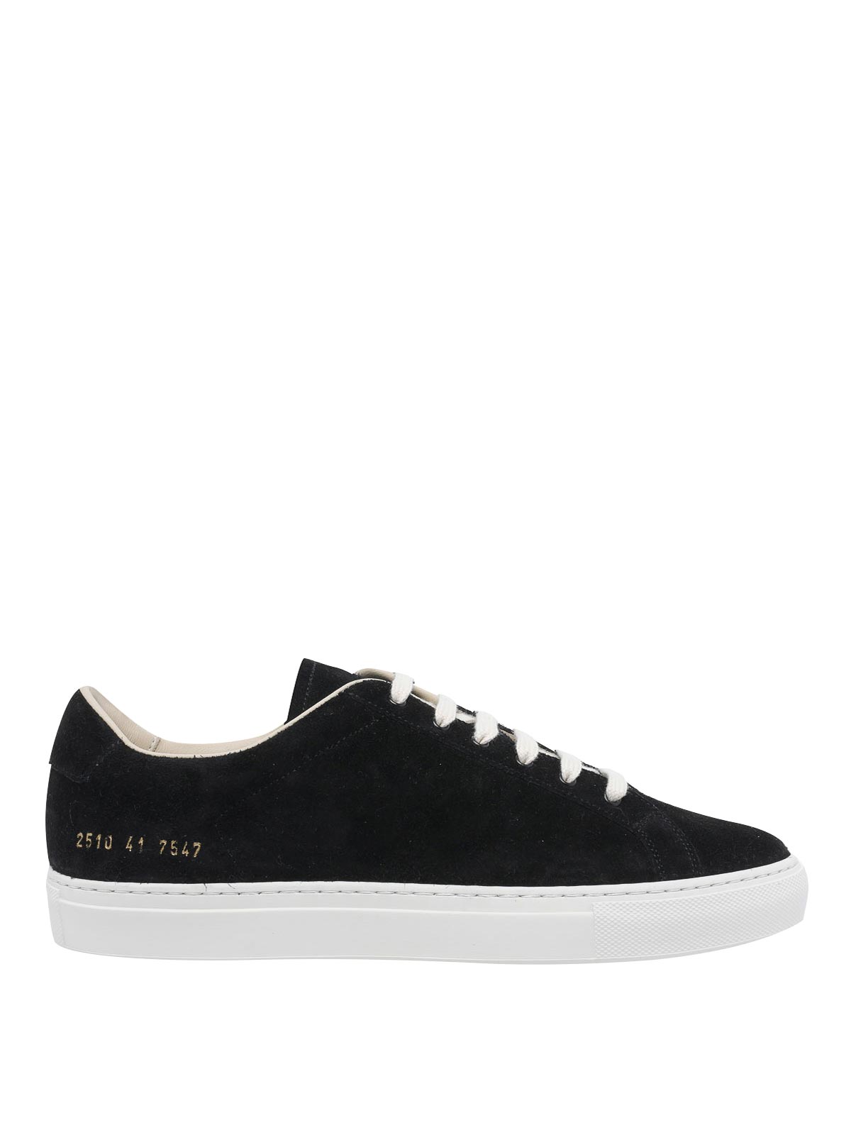 Common projects black suede achilles sport sneakers, round toe, lateral logo, laces closure