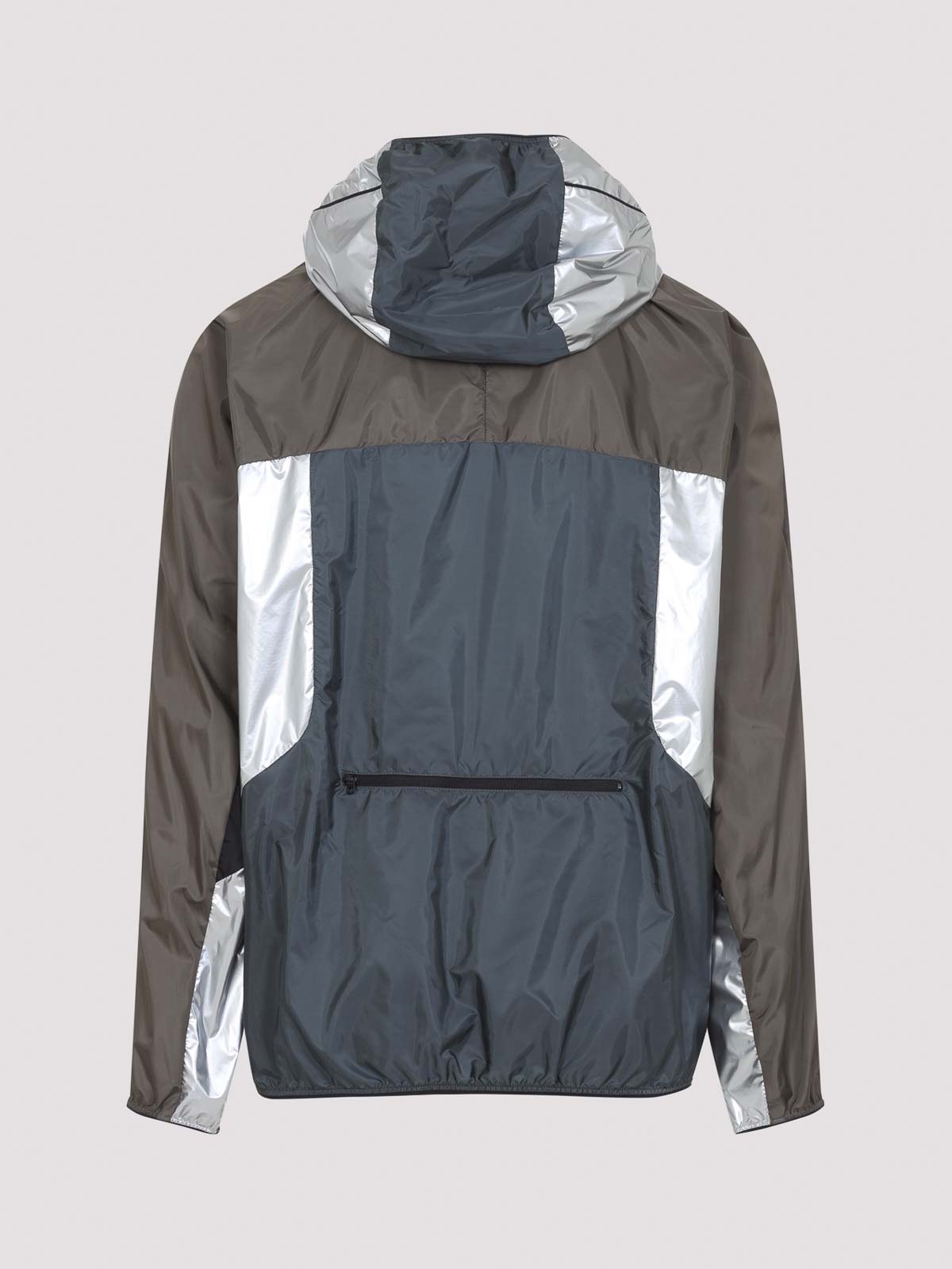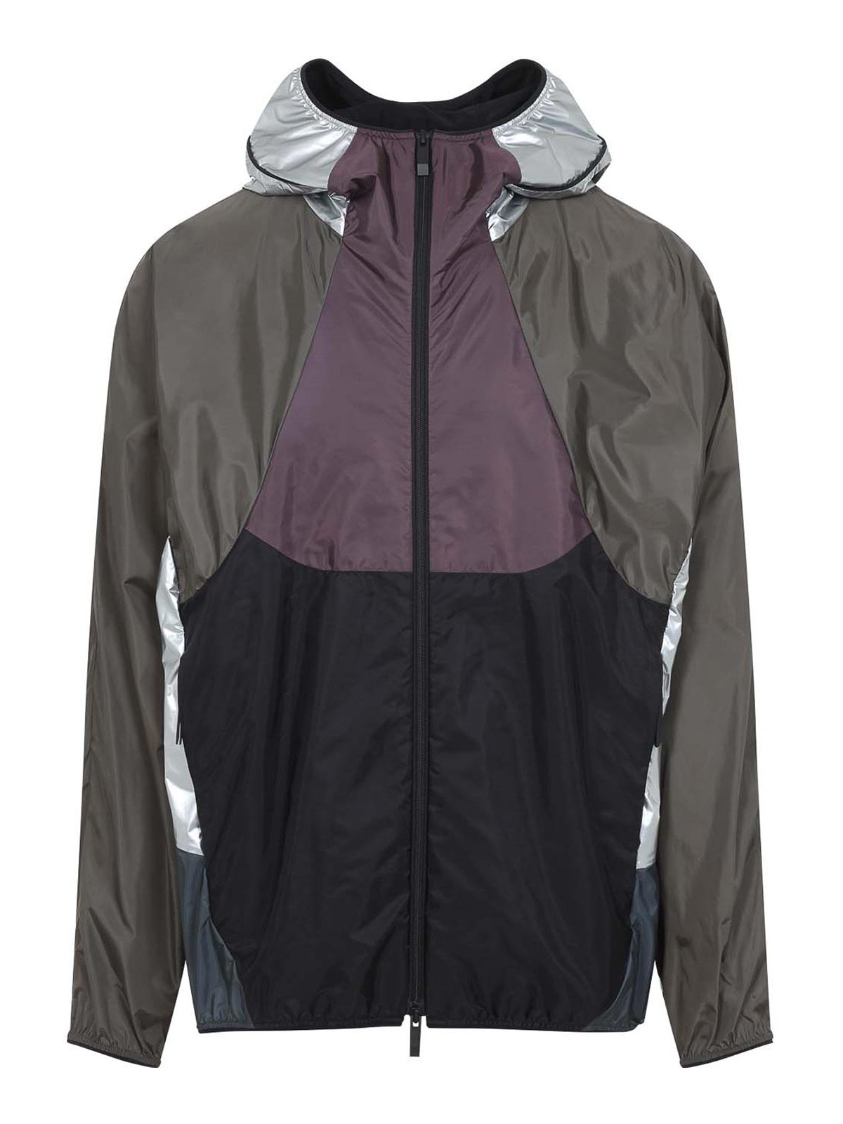 Moncler sormiou silver polyamide jacket. water-repellent jacket crafted from silver, black, and purple tech fabric, featuring a hood with drawstring, a front zip fastening, two zip fastenings, a logo patch on the sleeve, adjustable cuffs and hem, and packable design.