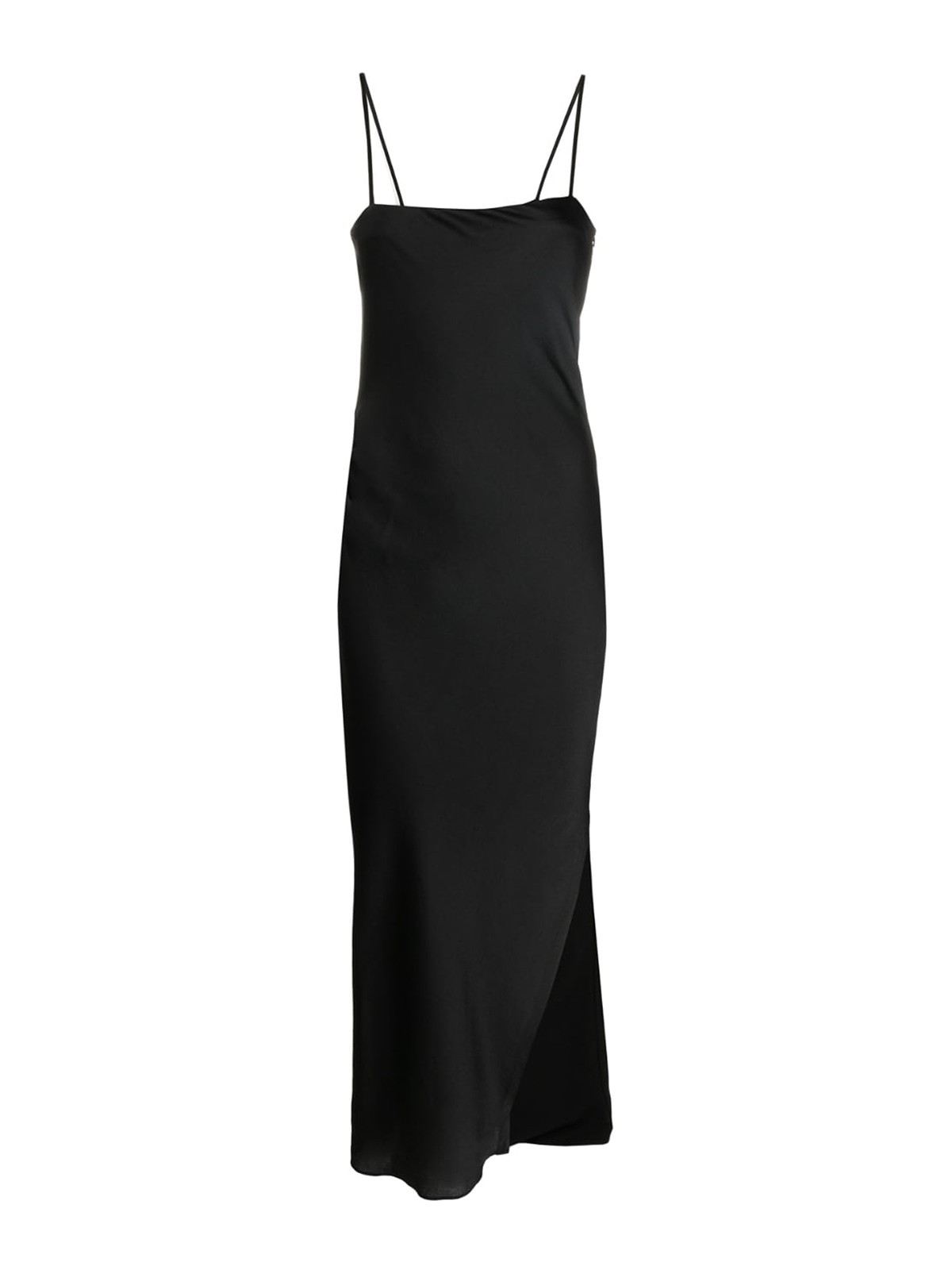 Side-slit satin-finish dress from iro featuring black, satin finish, fitted waistline, side slit, spaghetti straps, square neck and mid-calf length.