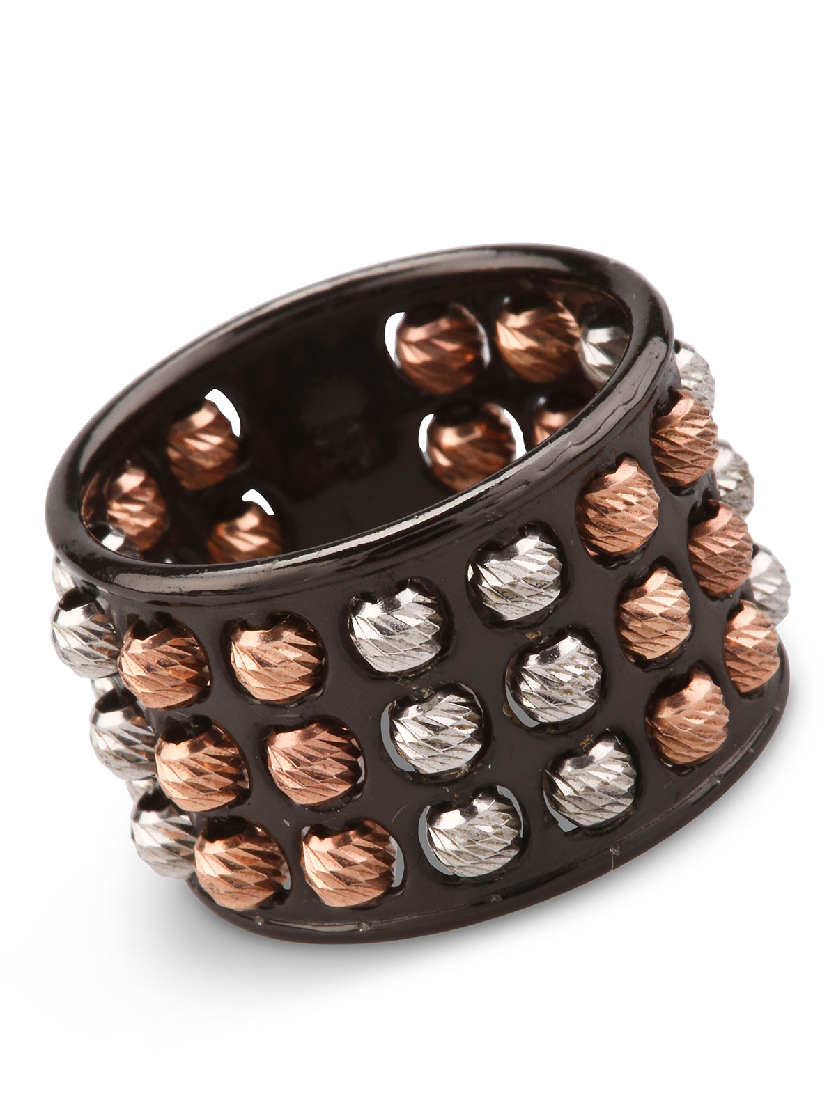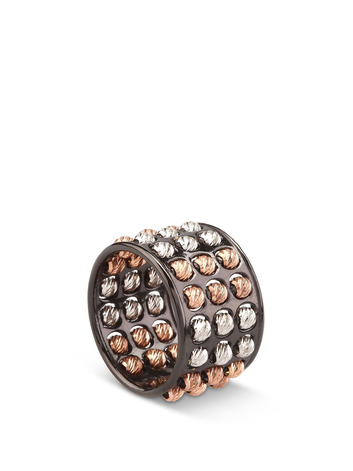 Sterling silver band ring; blacke-toned rhodium plate with yellow and rose-toned, rotating, diamond-cut beads. Nickel free, designed and produced by Italian jewellery specialists Athomie. This piece embodies a new concept of jewellery designed for the eyes and the touch. The pleasantly unexpected, rotating movement of the spheres generates sensations of wellbeing and harmony.