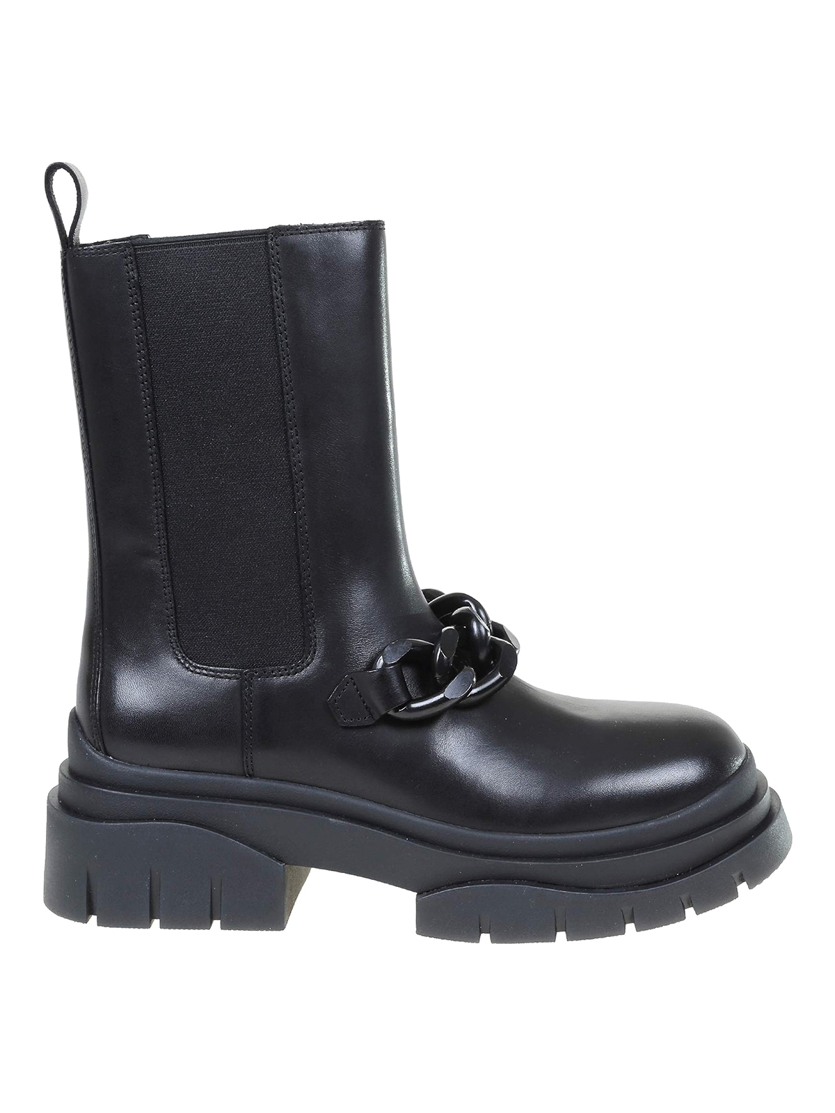 Smooth leather boots featuring elastic side inserts, chain detail, pull-tab on the back and chunky rubber sole.