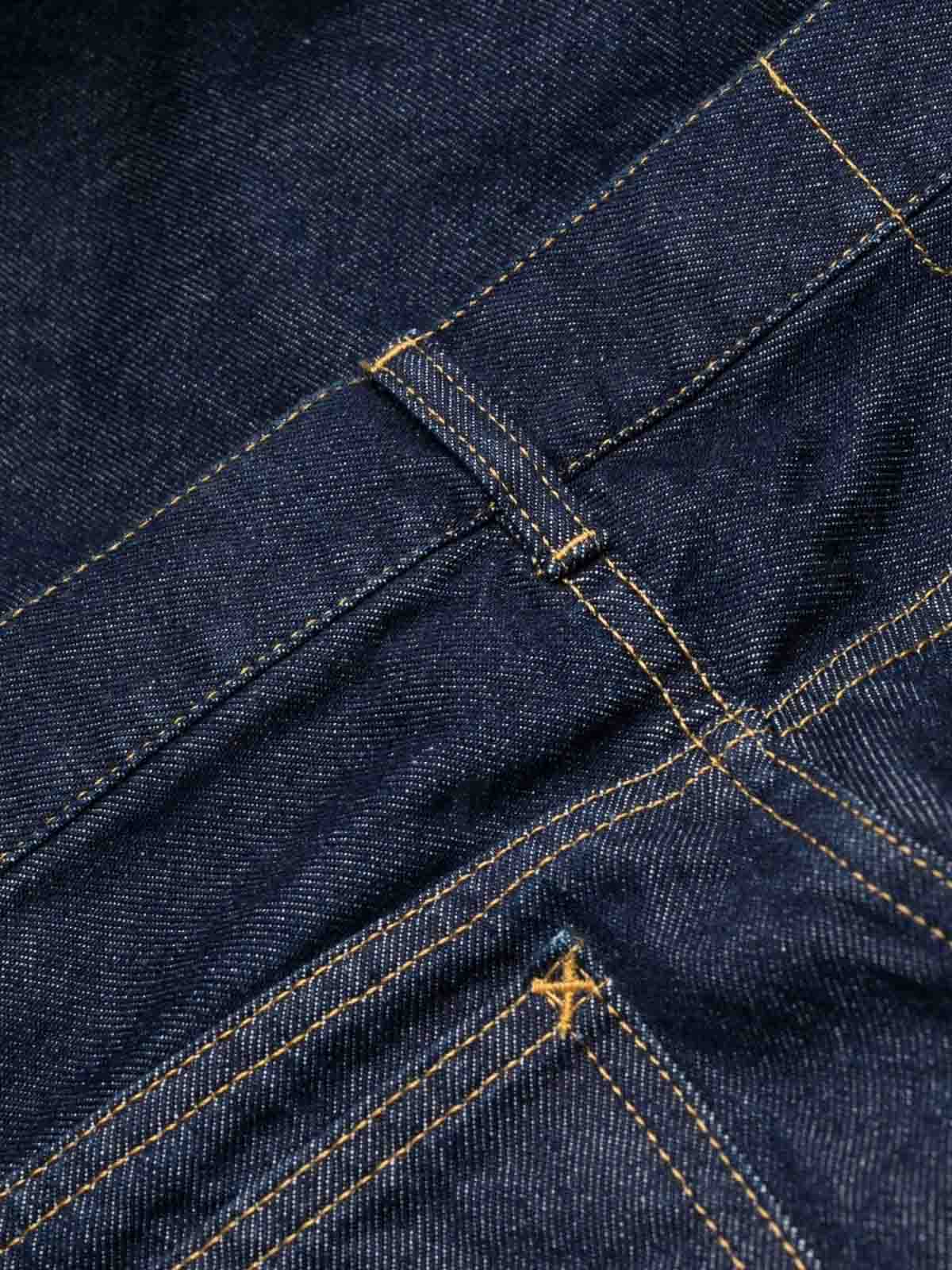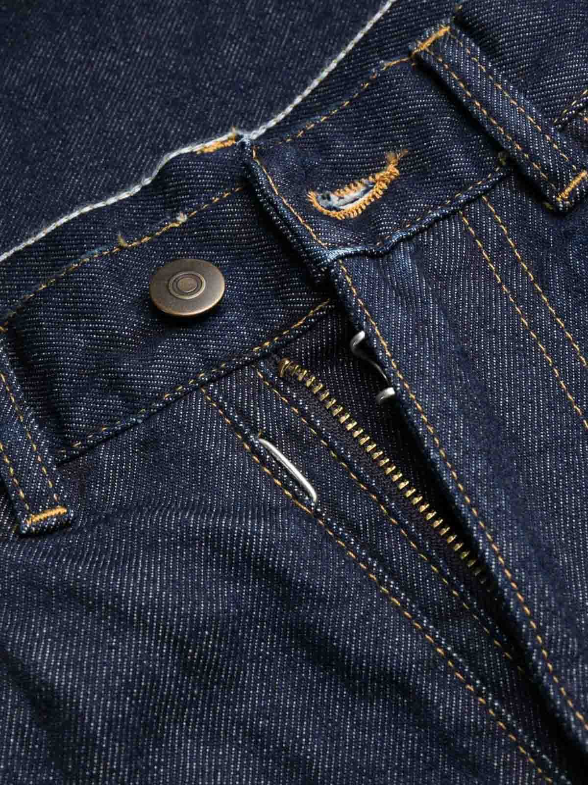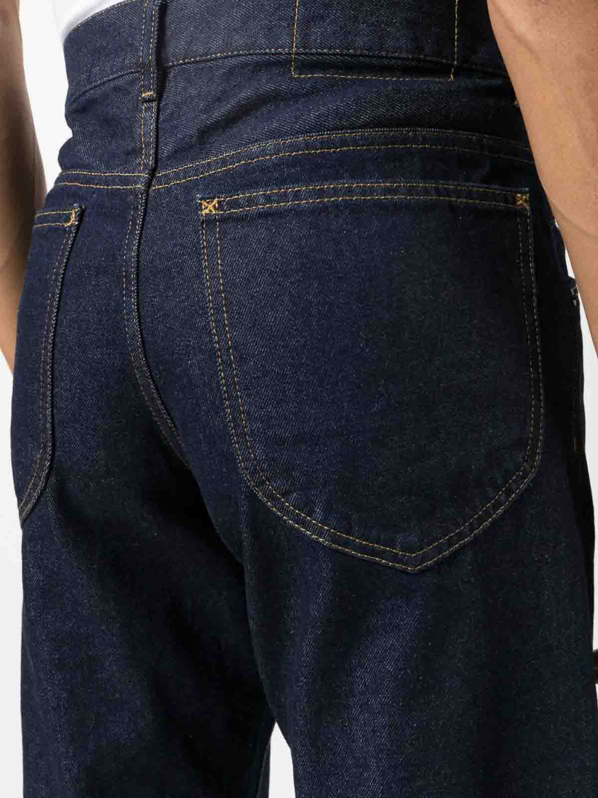 Indigo blue straight leg signature four-stitch logo mid-rise belt loops button and zip classic five pockets