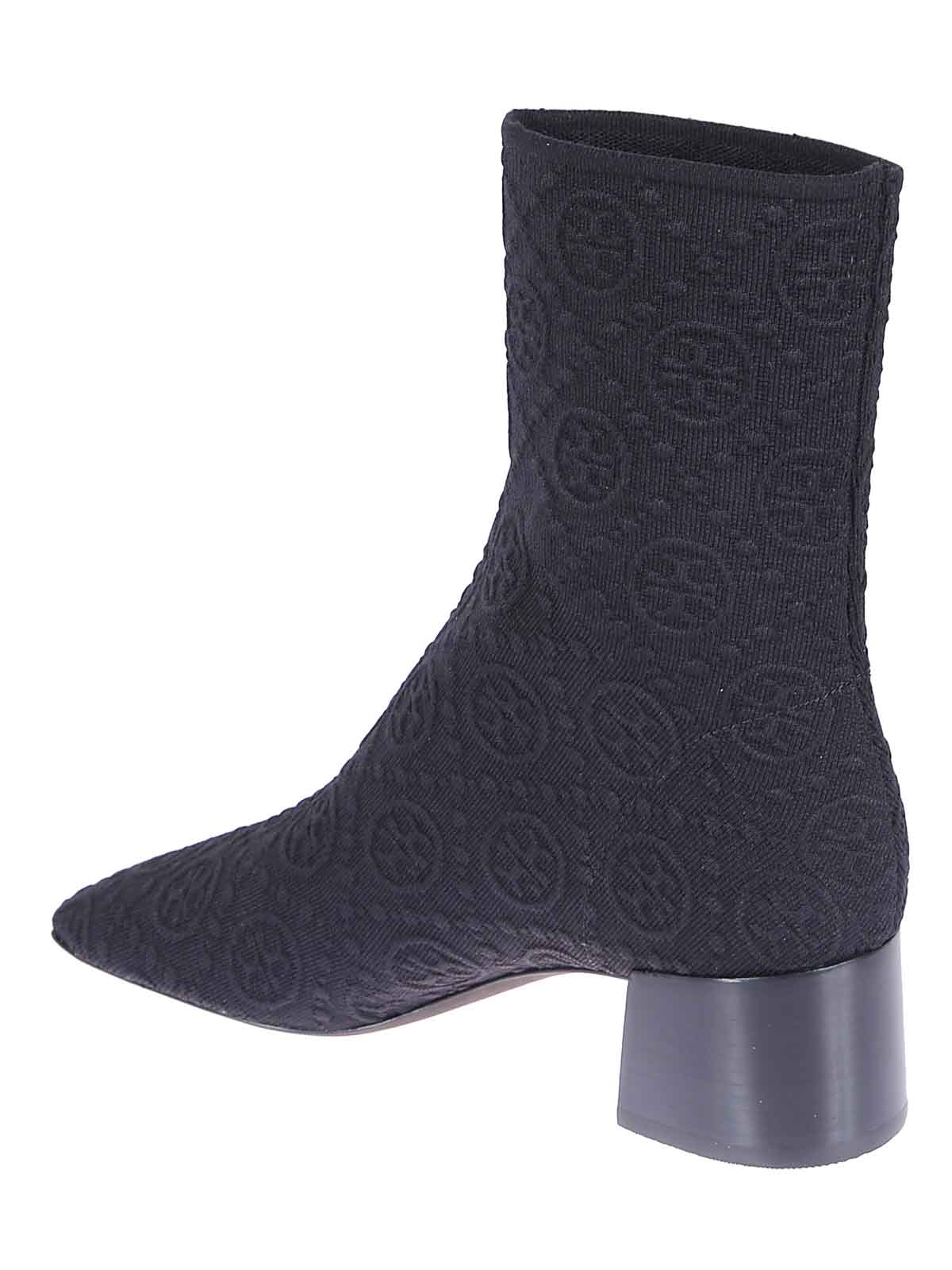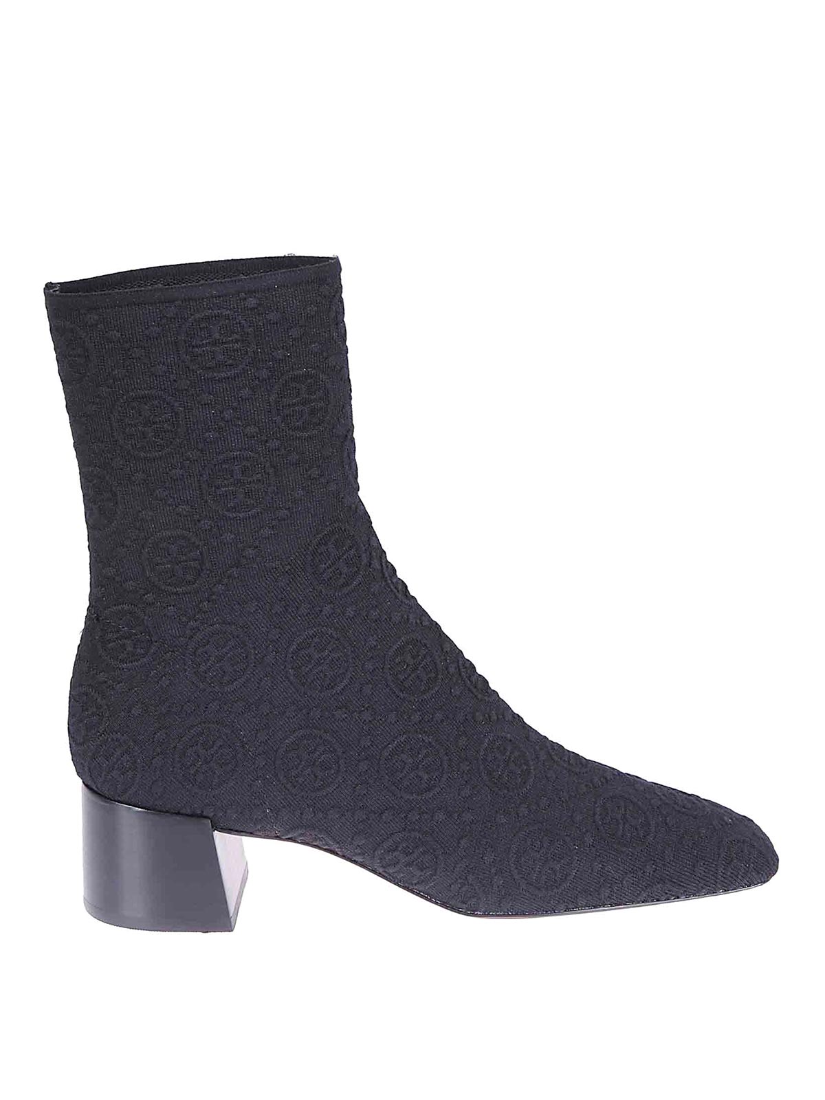 Ankle boot in stretch technical fabric with iconic jacquard logo, black colour, leather sole, 5 cm heel.
