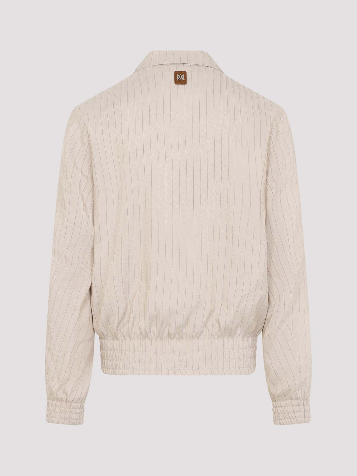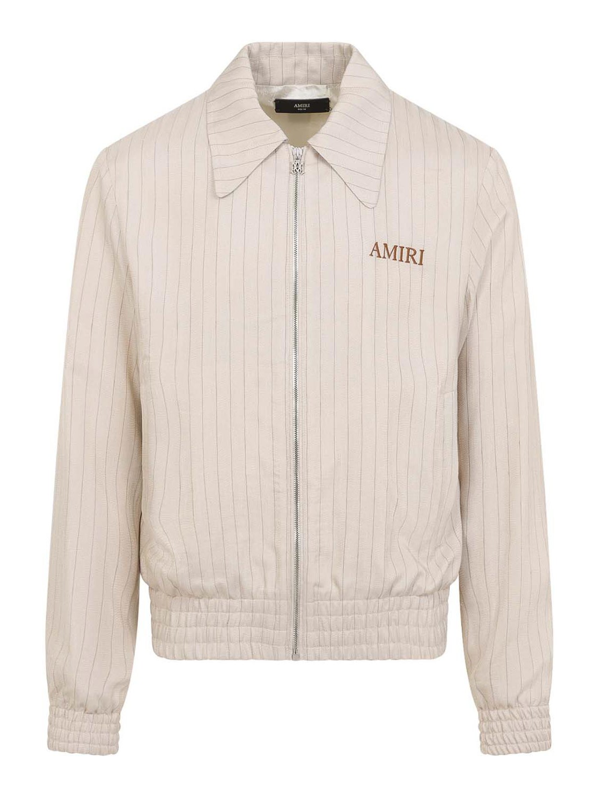Amiri striped beige viscose and linen jacket. crafted from pinstriped beige viscose and linen, featuring a pointed collar, a front zip fastening, embroidered logo on the chest, branded label at the back of the collar, elastic cuffs and hem, and a full lining.
