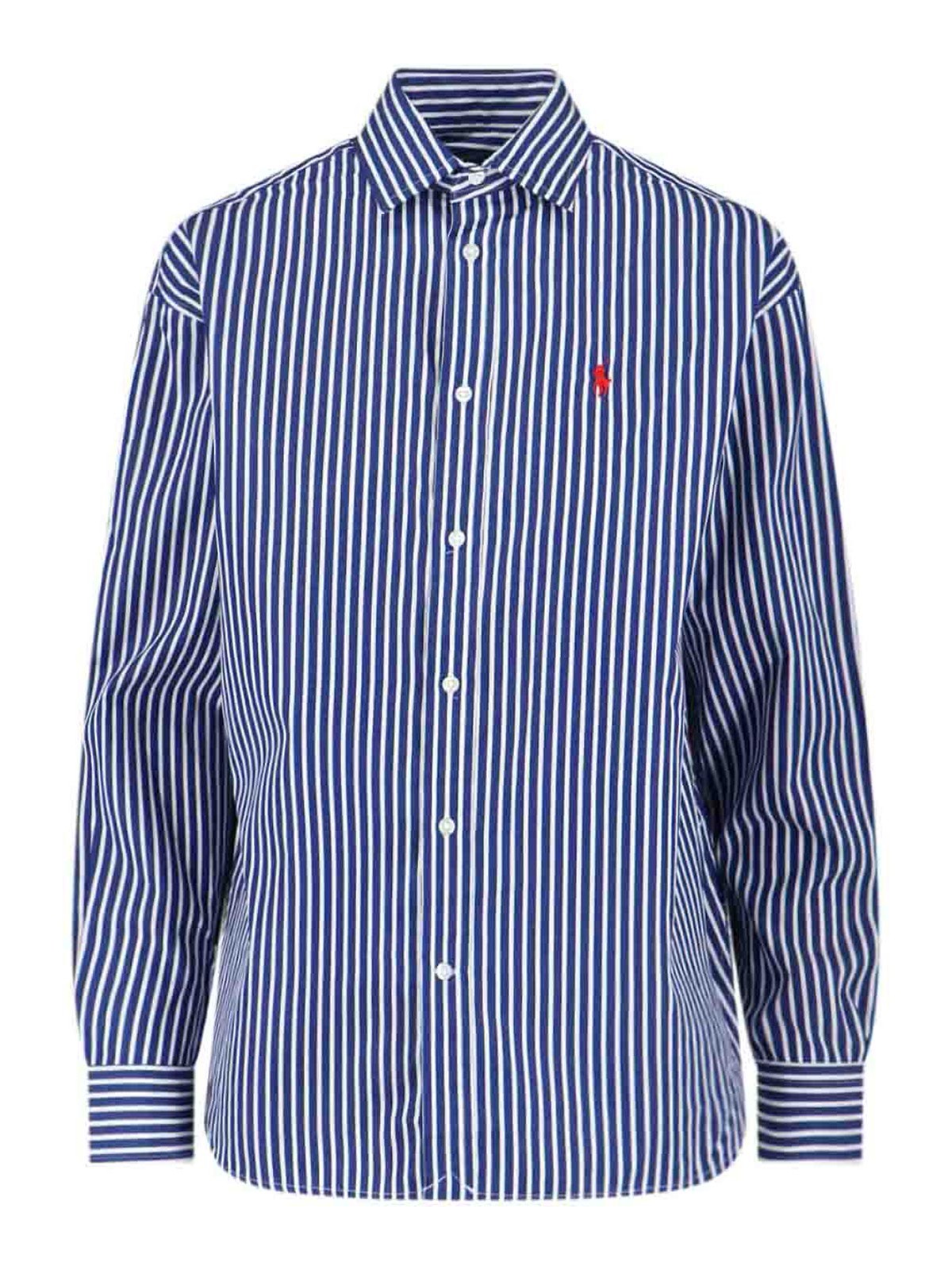 Polo Ralph Lauren logo striped shirt, in blue and white cotton, classic collar, button closure, buttoned cuffs, chest logo embroidery, curved hem.