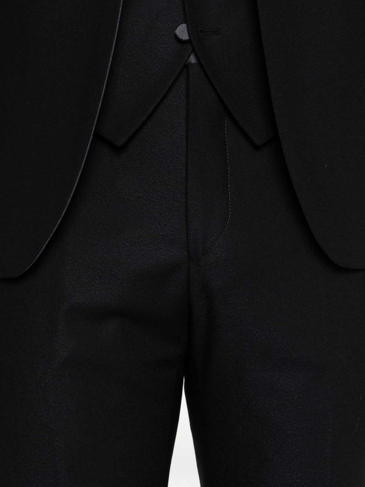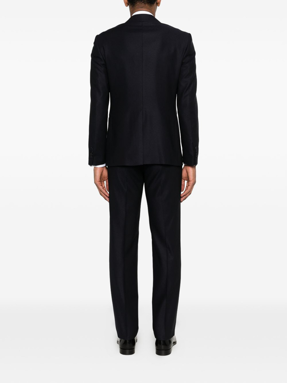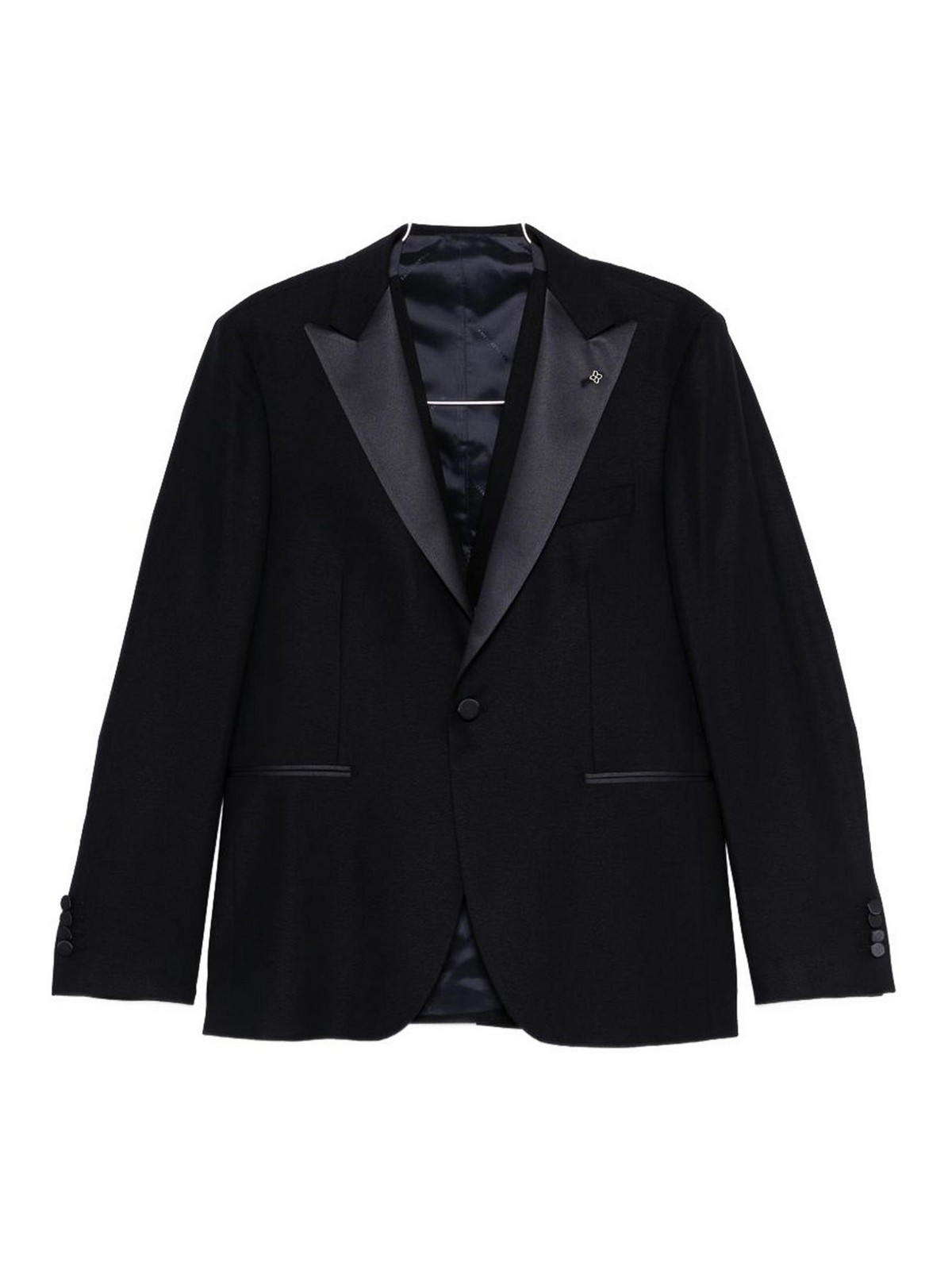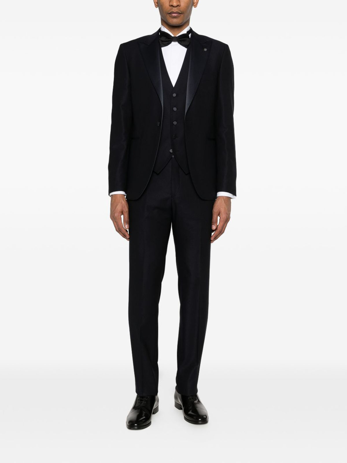 Blue shawl lapel single breasted button fastening welt pockets sleeveless waistcoat buttoned cuffs