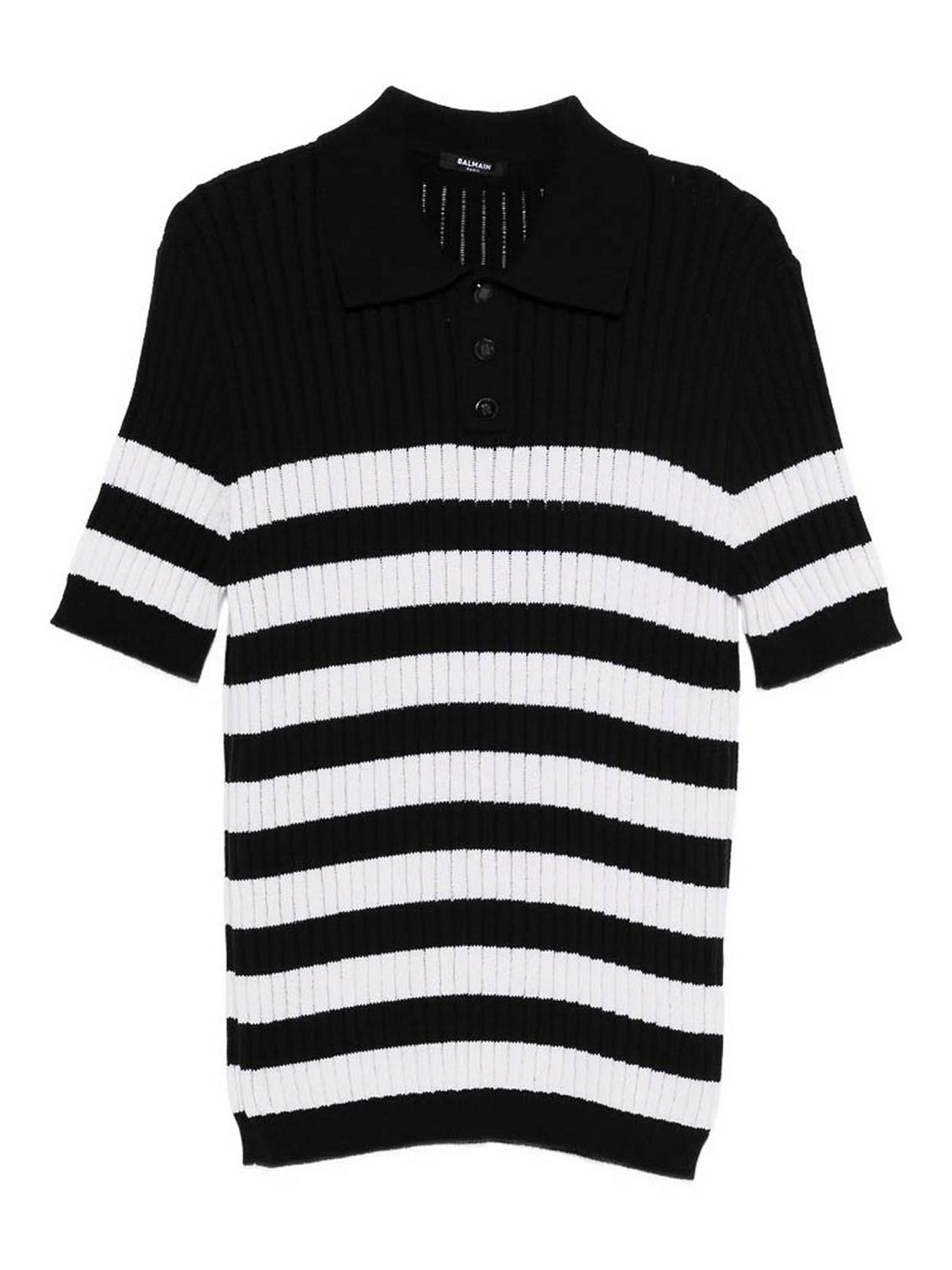 Black striped pattern ribbed knit polo collar button fastening short sleeves