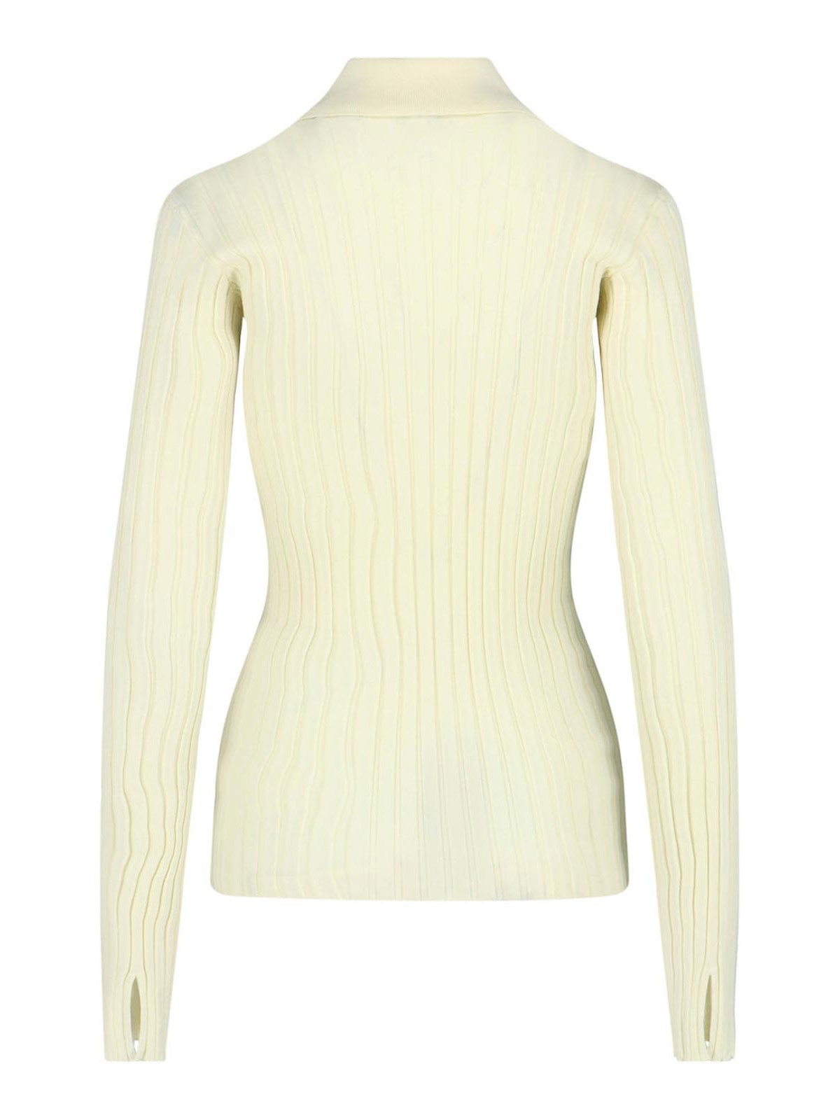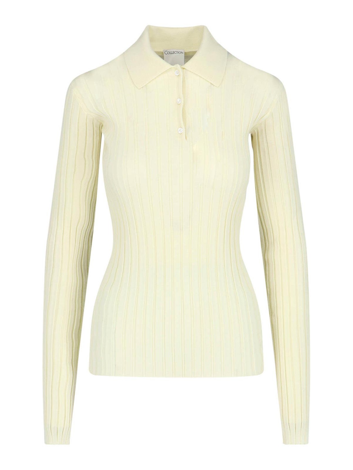 Amber Calvin Klein Collection sweater, in yellow wool, ribbed workmanship, classic collar, button closure, slits on cuffs, straight hem.
