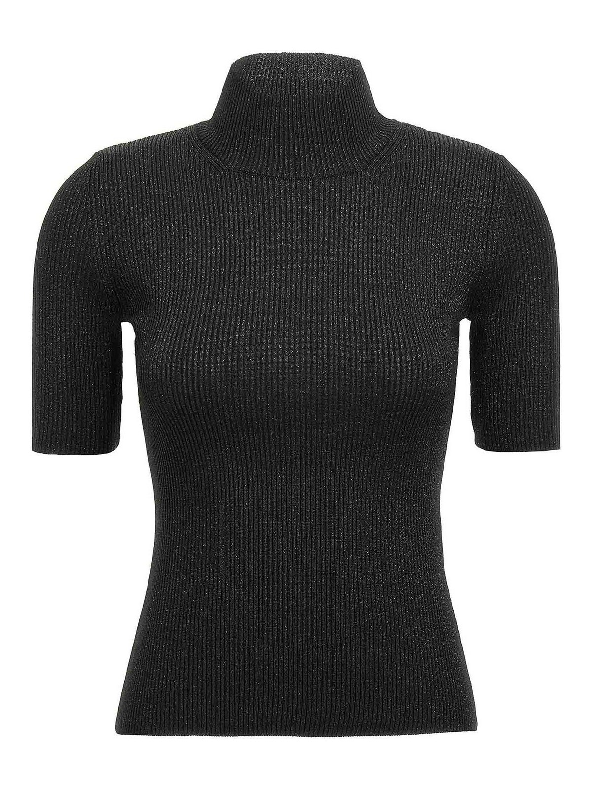 Ribbed knit 'roll-neck' lurex sweater, stretch sweater, high neck and short sleeves.