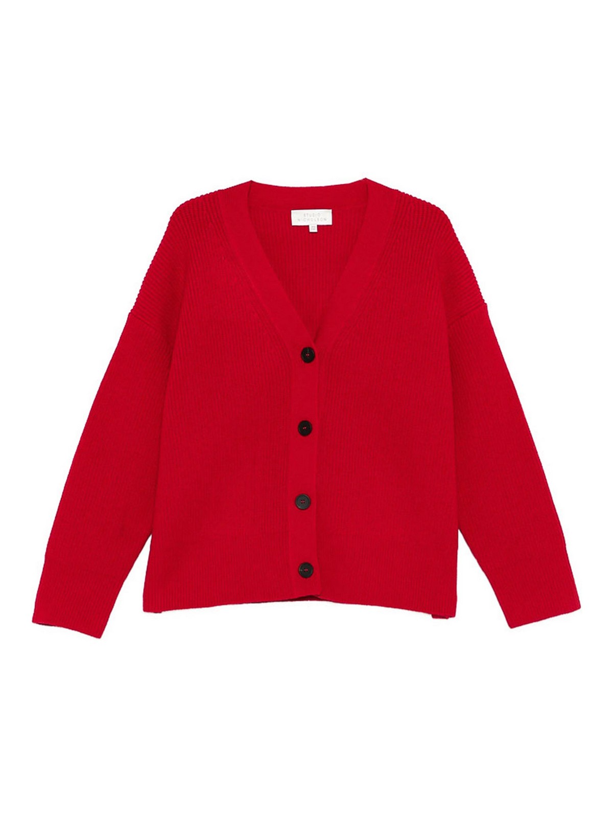Red, merino wool, front button fastening, ribbed knit, v-neck, long sleeves