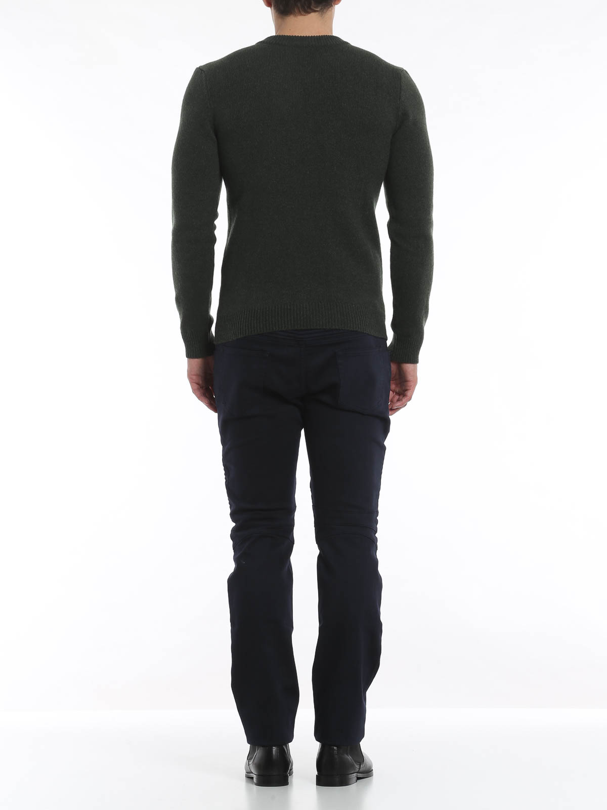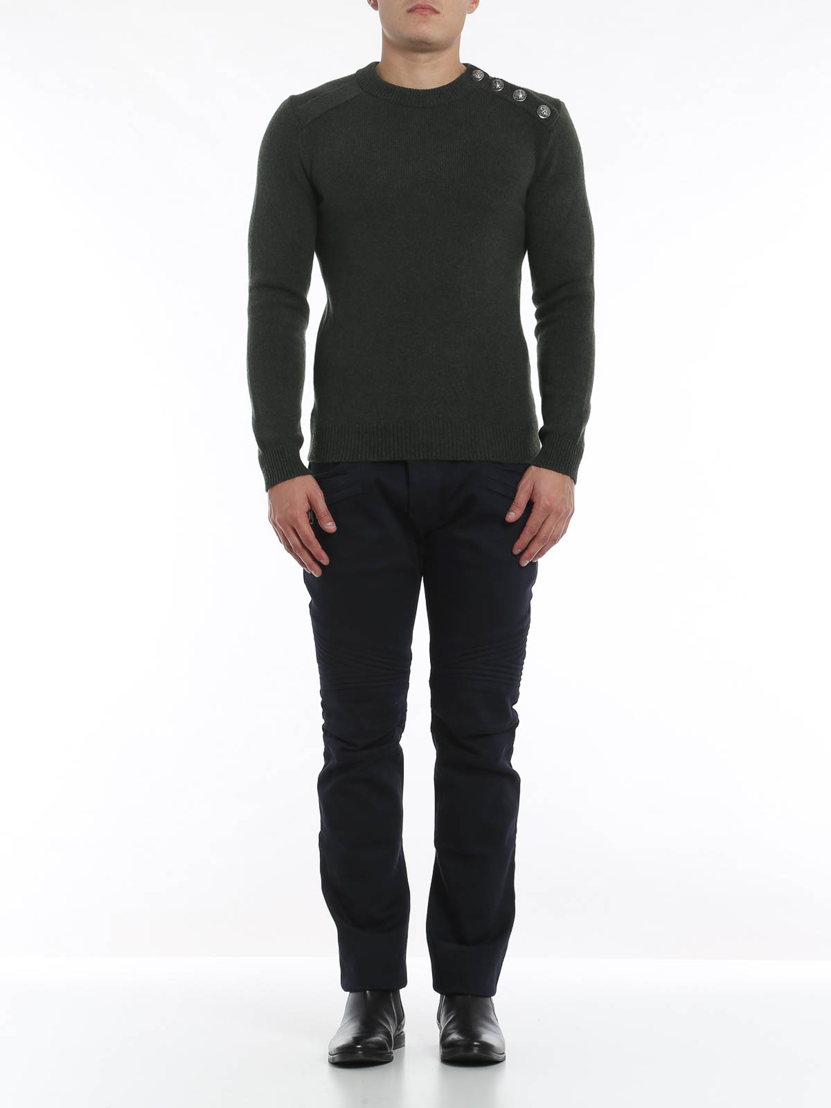 Crew neck wool sweater adorned with metal buttons at shoulder.