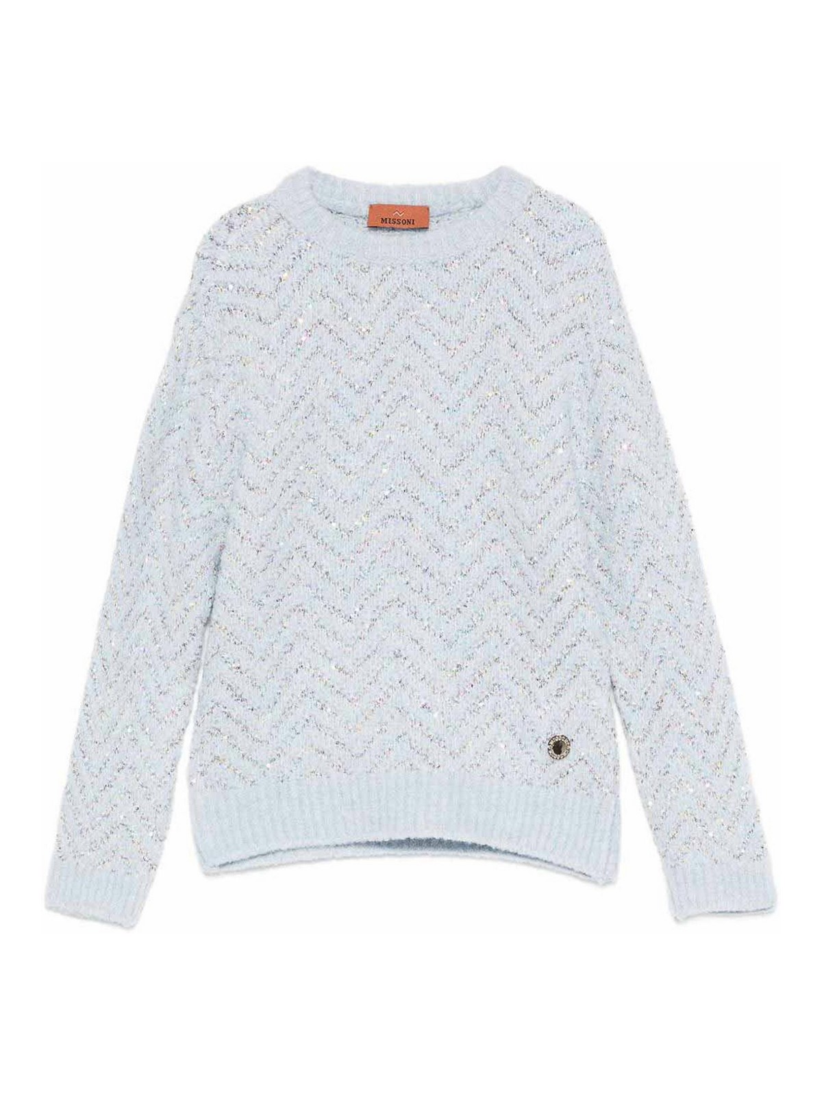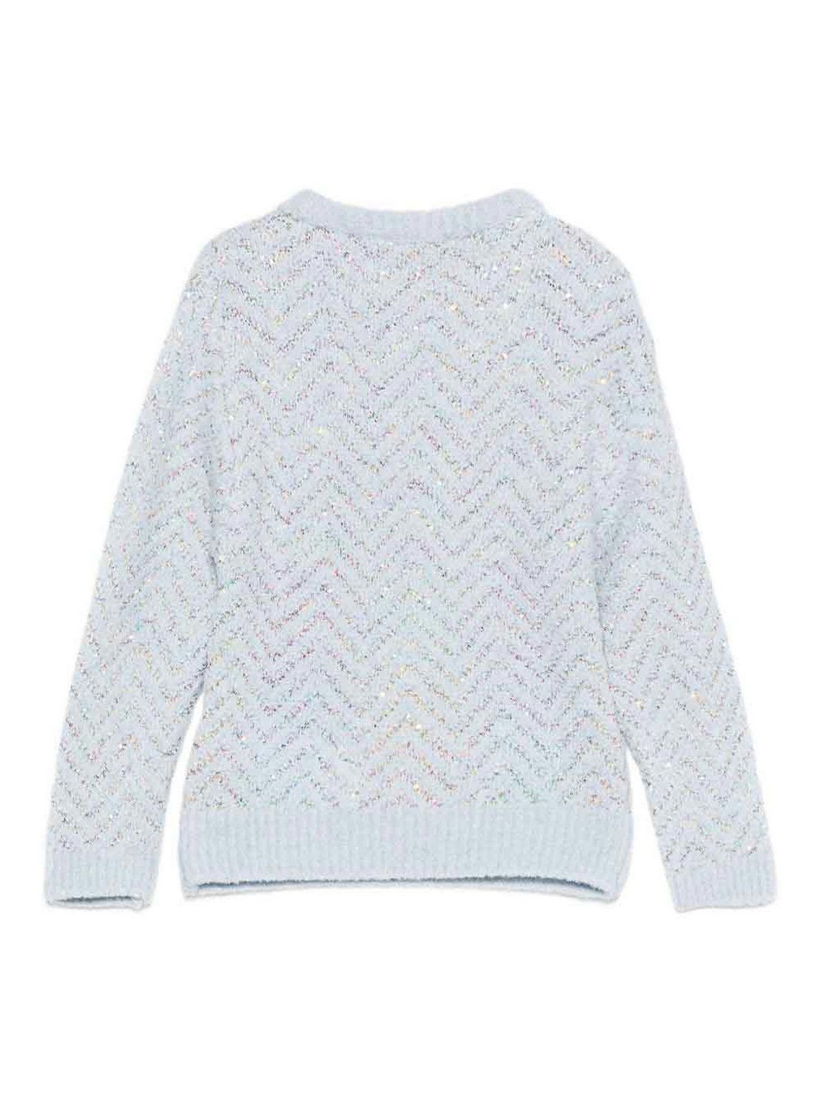 Pullover with sequins features light blue chevron motif decoration with sequins long sleeves round neckline metallic thread the article may differ slightly from the image this happens because missoni products are handcrafted