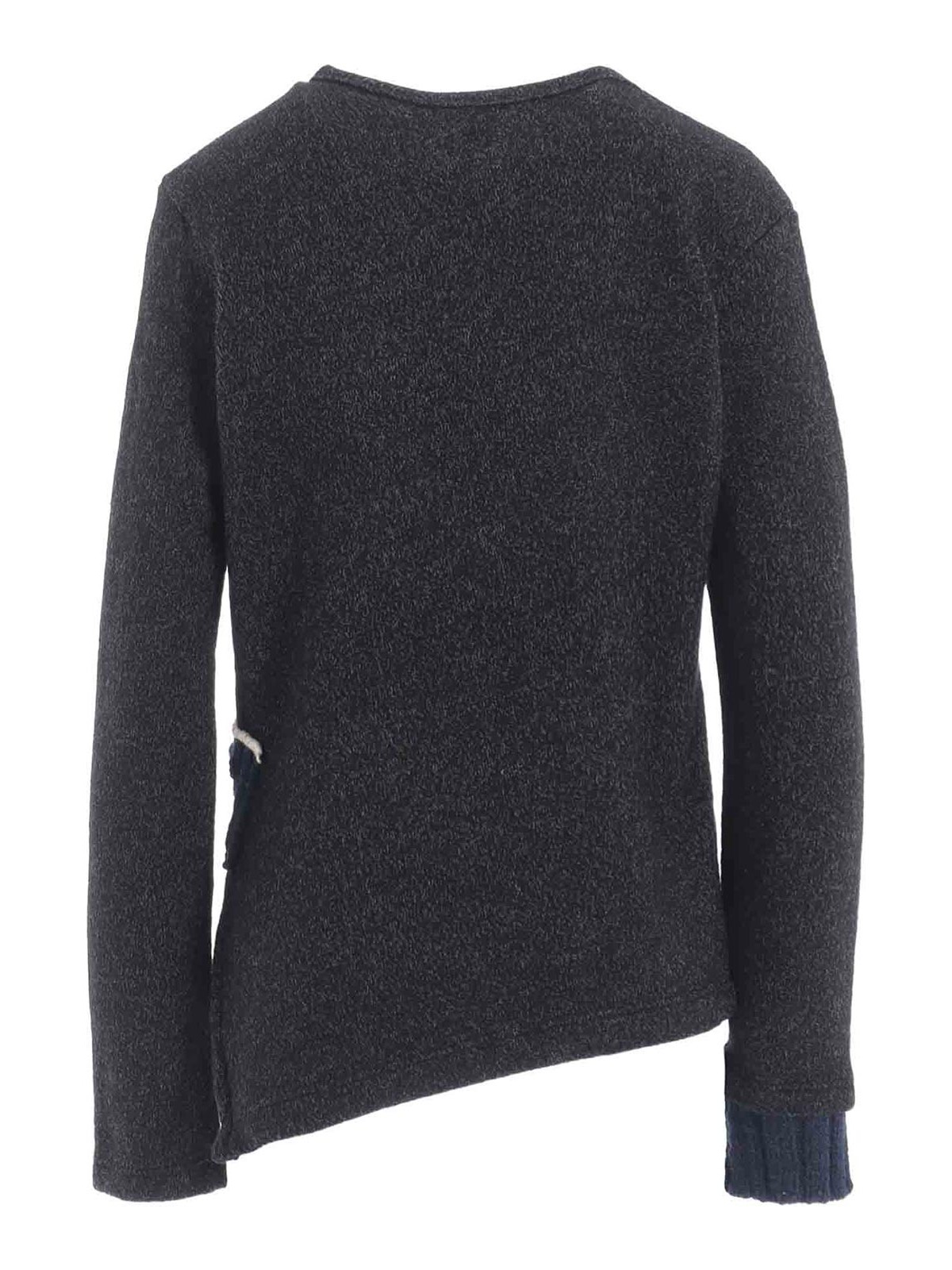 Charcoal wool blend sweater, crew neck, blue knitted patch pocket, knitted right cuff, left side vent.