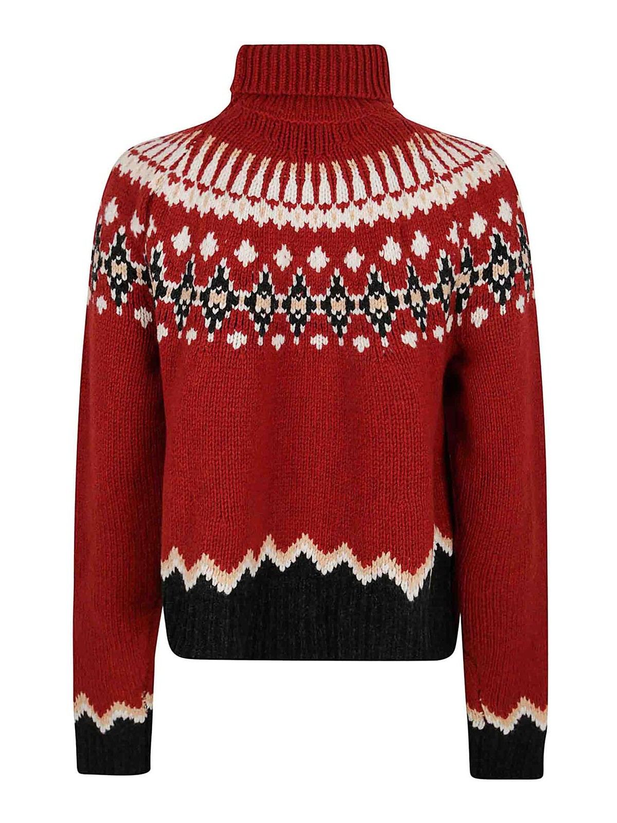 Sweet winter virgin wool turtleneck by alanui, high collar with cuffs, long sleeves, raglan fit, ribbed trims, featuring a revisited Fair Isle pattern in a placed jacquard knit, Nordic style.