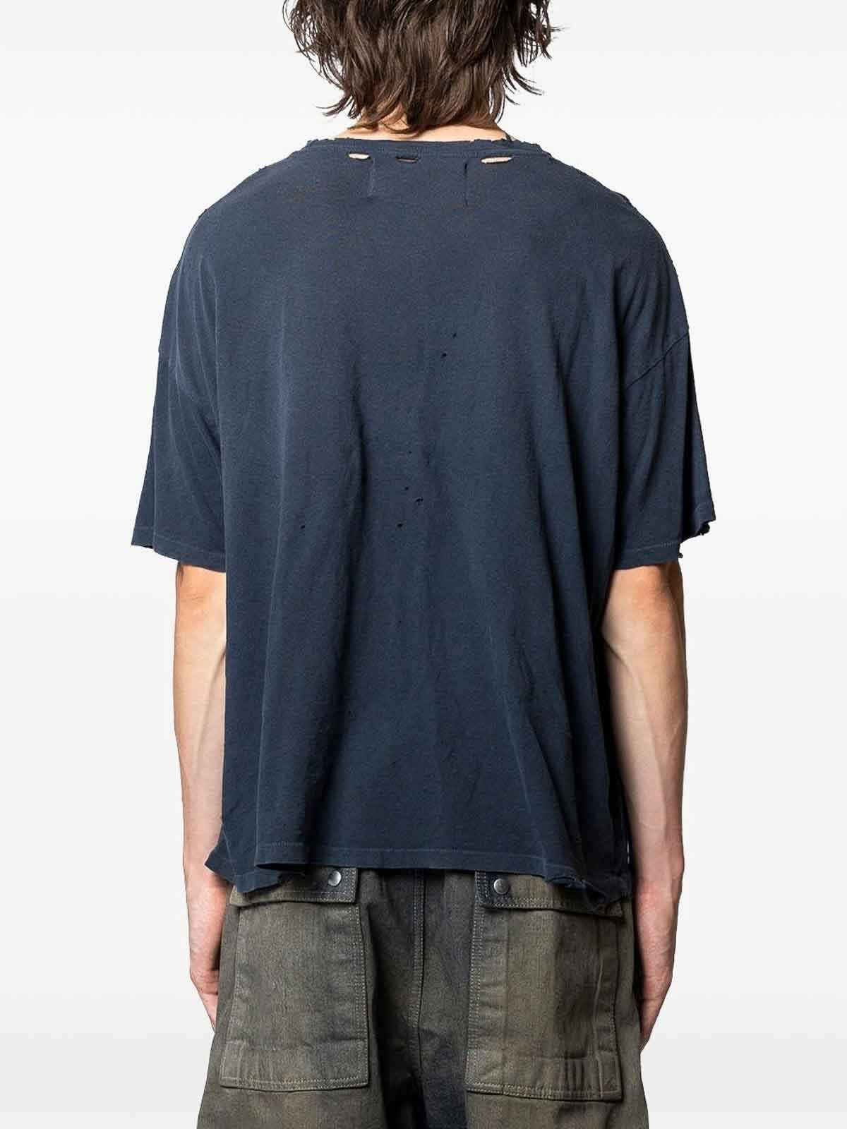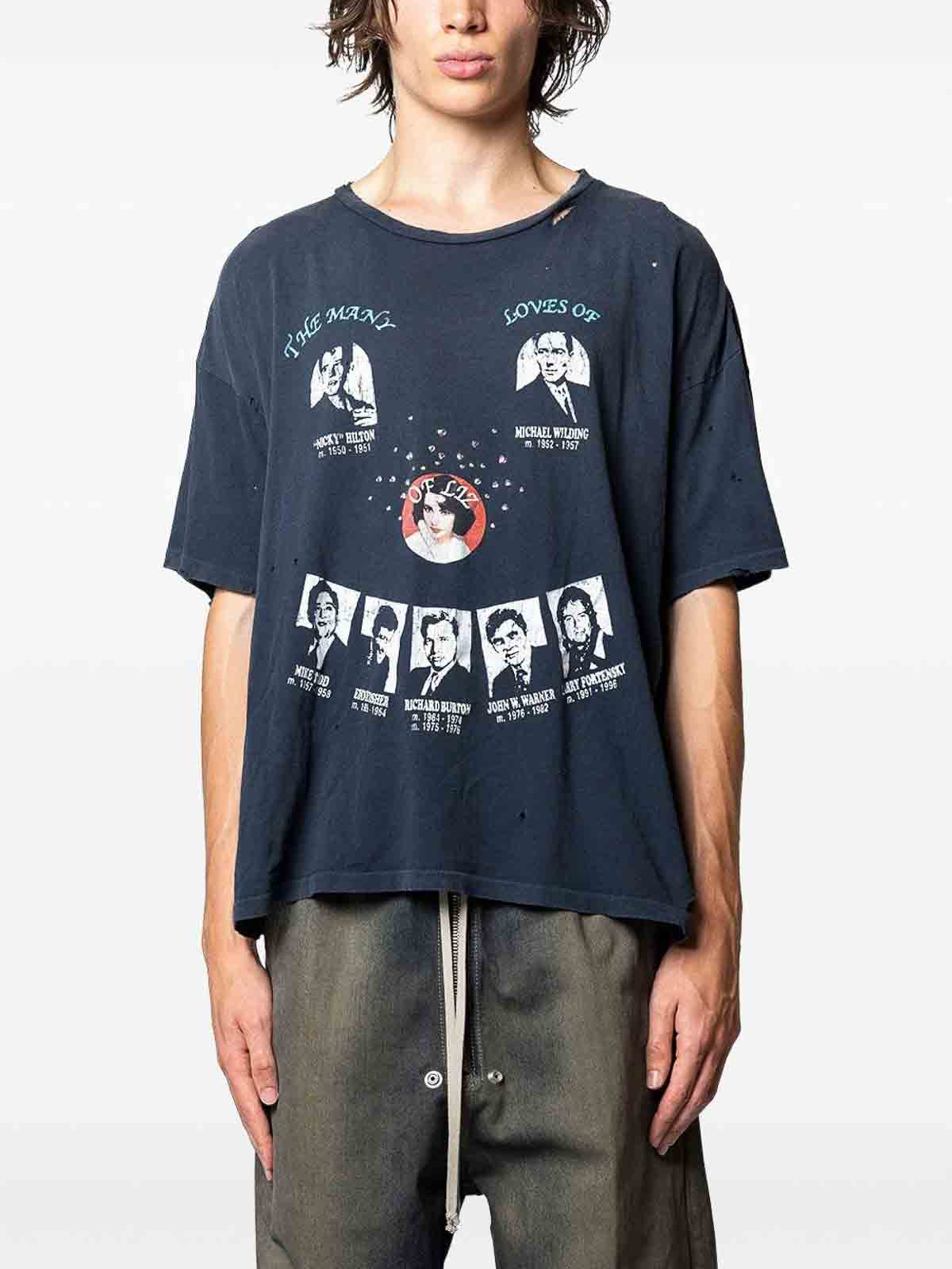 Features black distressed effect graphic print crew neck short sleeves raw cut hem