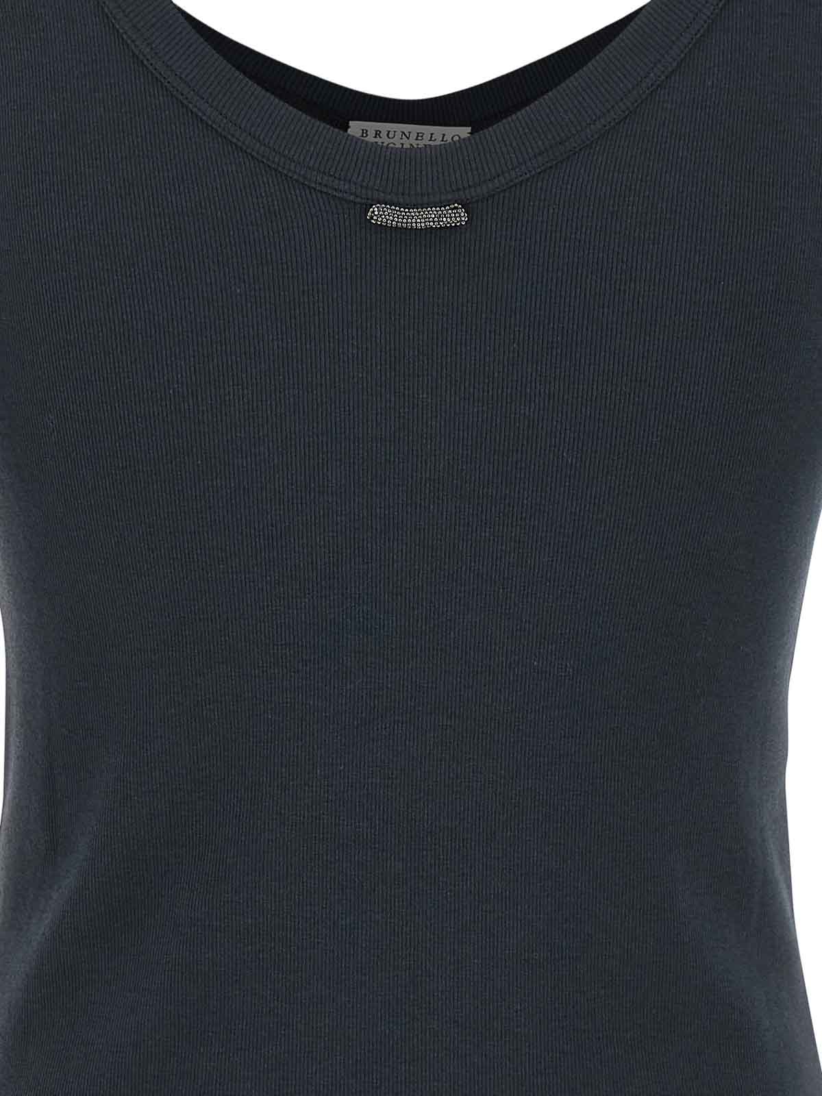 Stretch cotton ribbed jersey t-shirt with wide round neckline on the front and back, back monile detail, and short sleeves.