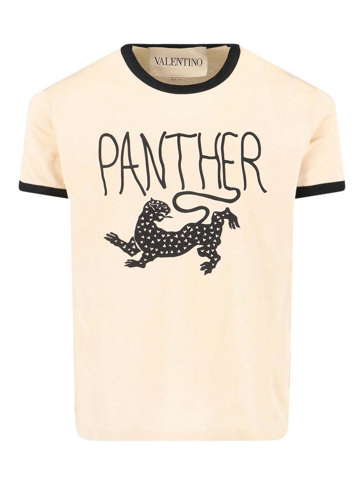 Valentino panther T-shirt in cream cotton, crew neck, short sleeves, panther detail printed on the front, contrasting finishes, straight hem.