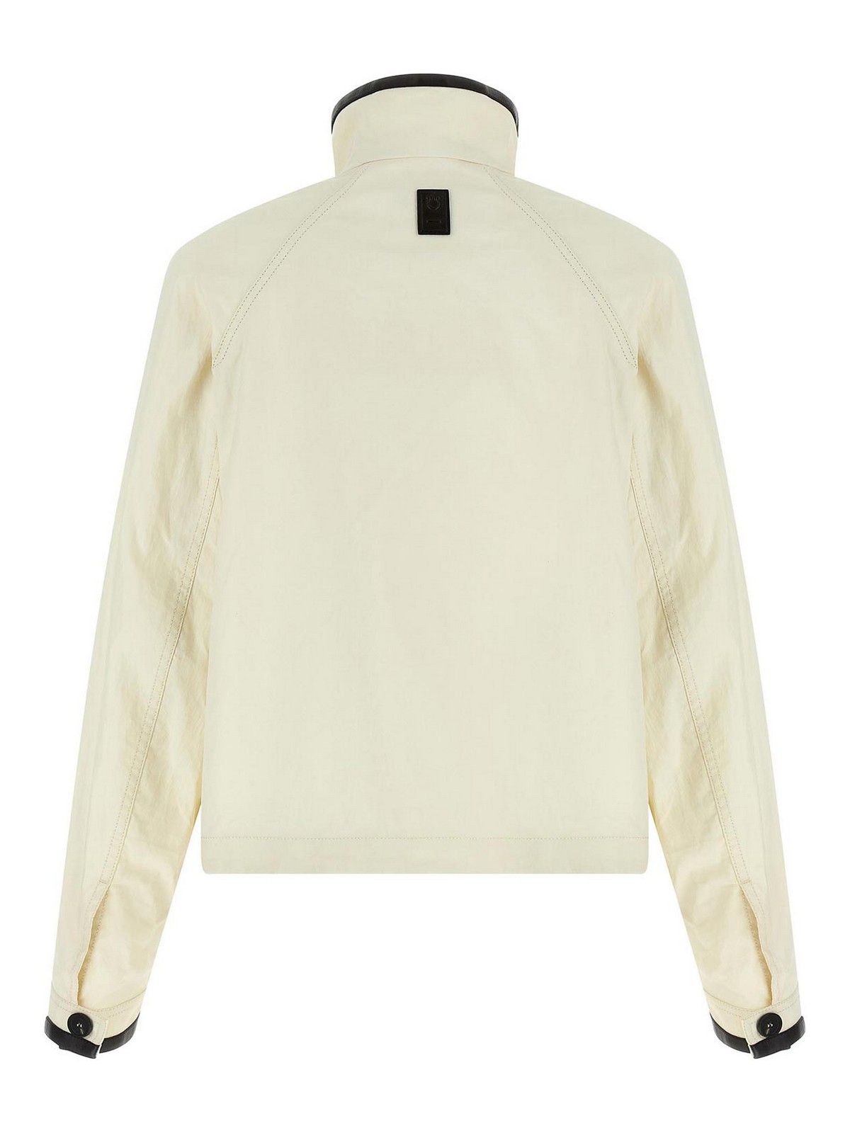 Straight and short jacket in technical linen fabric, high neck with contrasting leather detail on the edge, front zip and flap closure with side buttons, front gusset pockets with leather and flap details with metal hook closure, long sleeves with cuffs and buttons and leather details, adjustable inner drawstring at the hem.