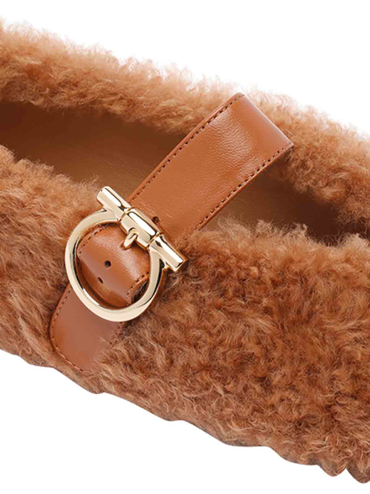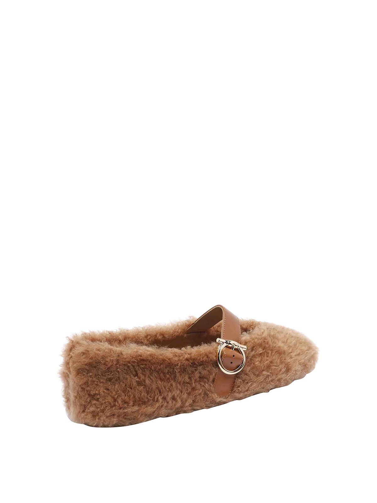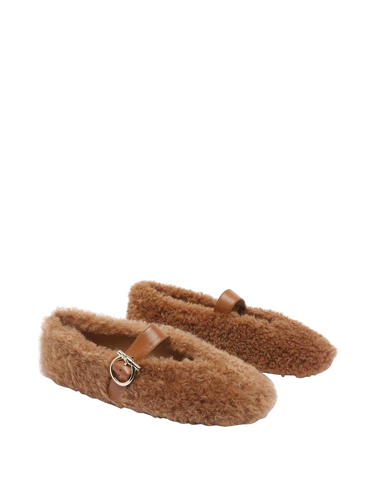 Ferragamo brown teddy ballets round toe teddy effect lateral buckle