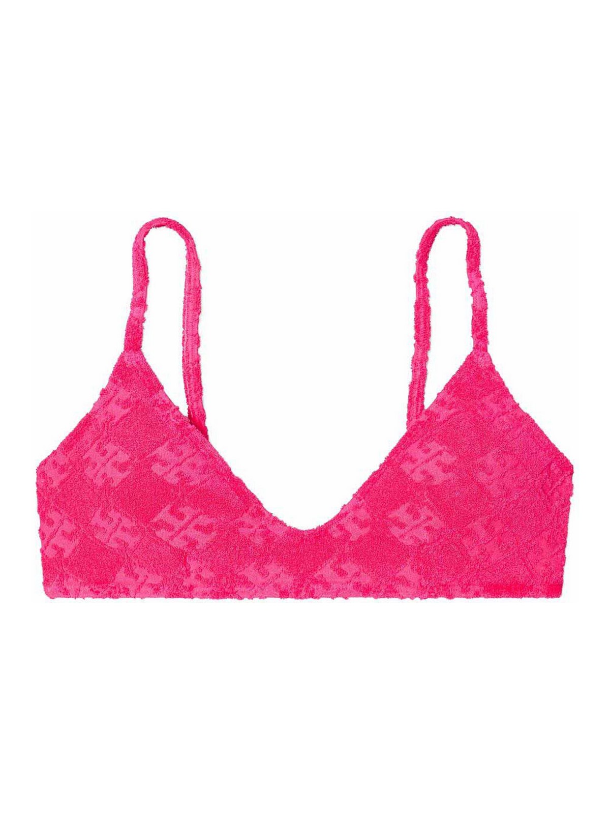 Bright pink all-over logo pattern adjustable shoulder straps v-neckline be mindful to try on swimwear over your own garments.