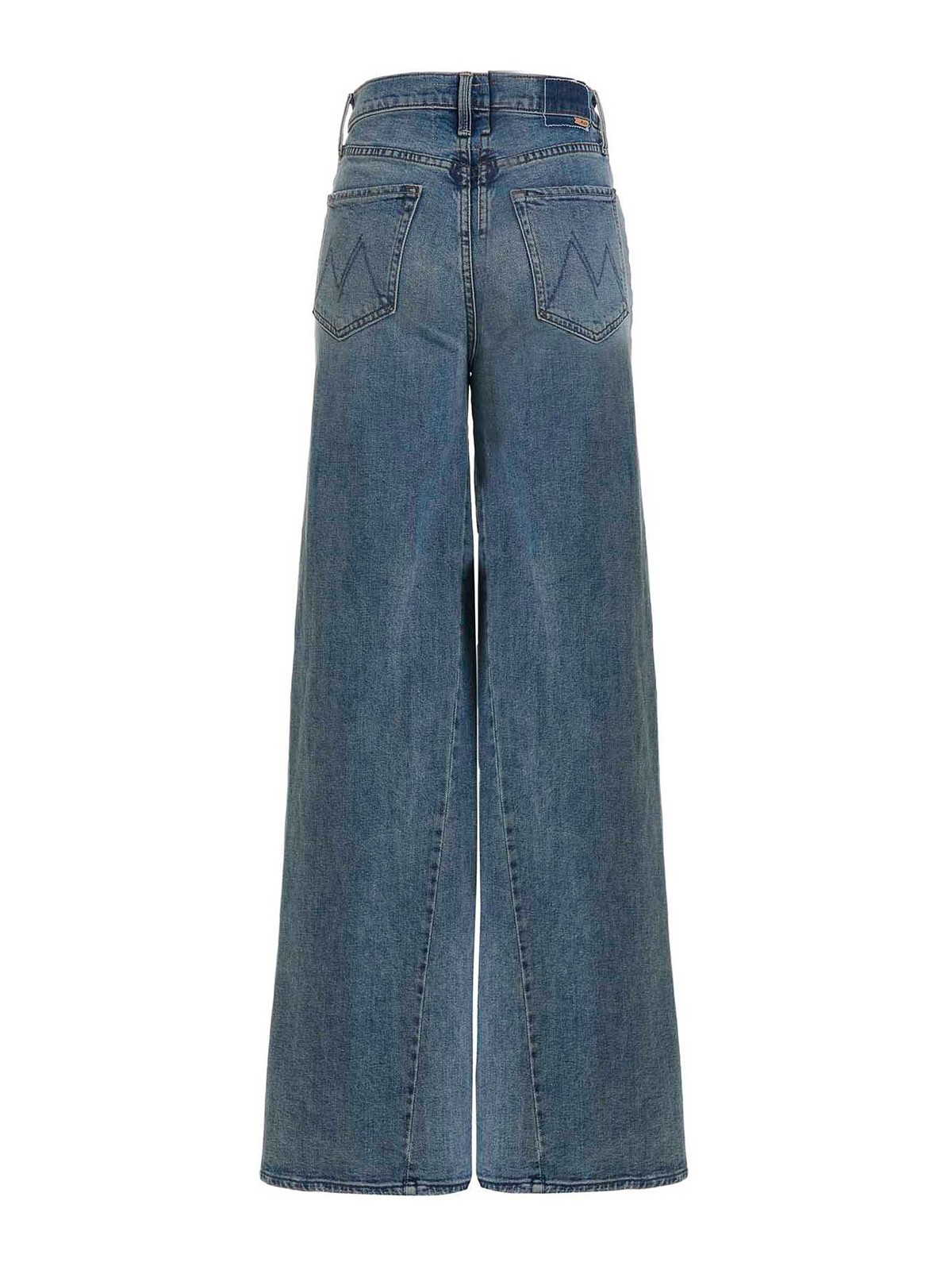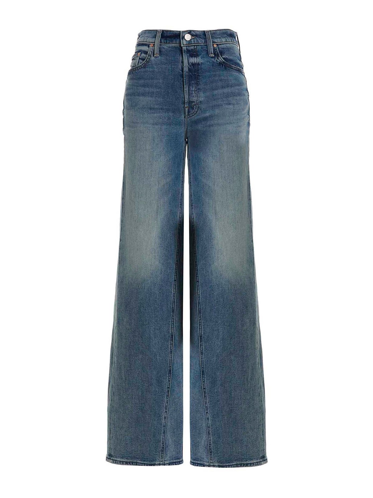 Stretch denim jeans with very wide leg and high waist, 5 pockets and a button closure.