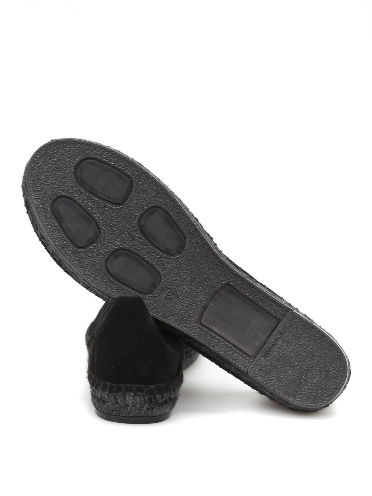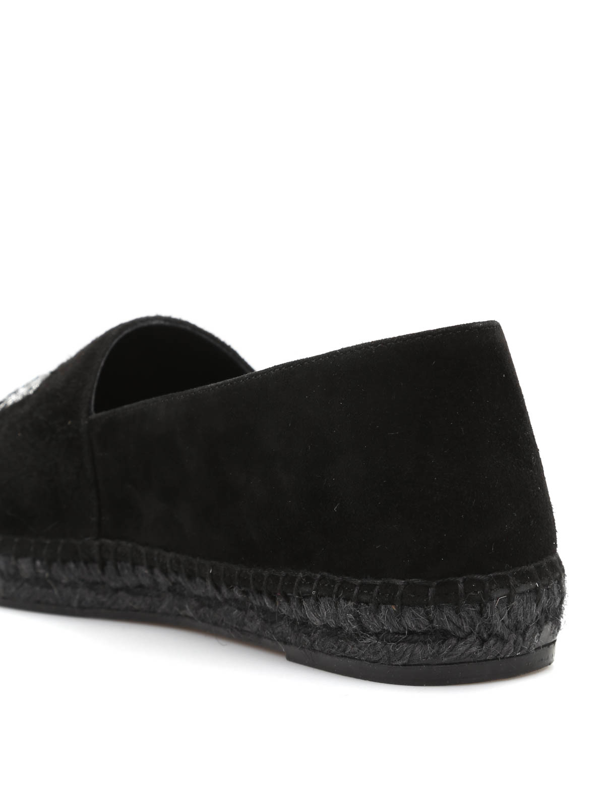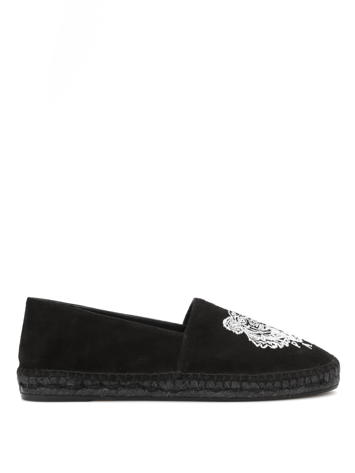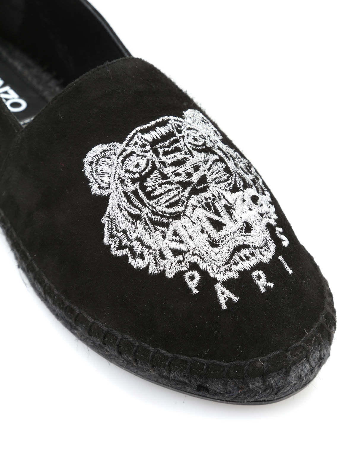 Suede espadrilles from Paris Runway collection, featuring silver-tone embroidered tiger logo on front and braided tonal jute mid-sole. Round toe, leather inner and flat rubber sole.