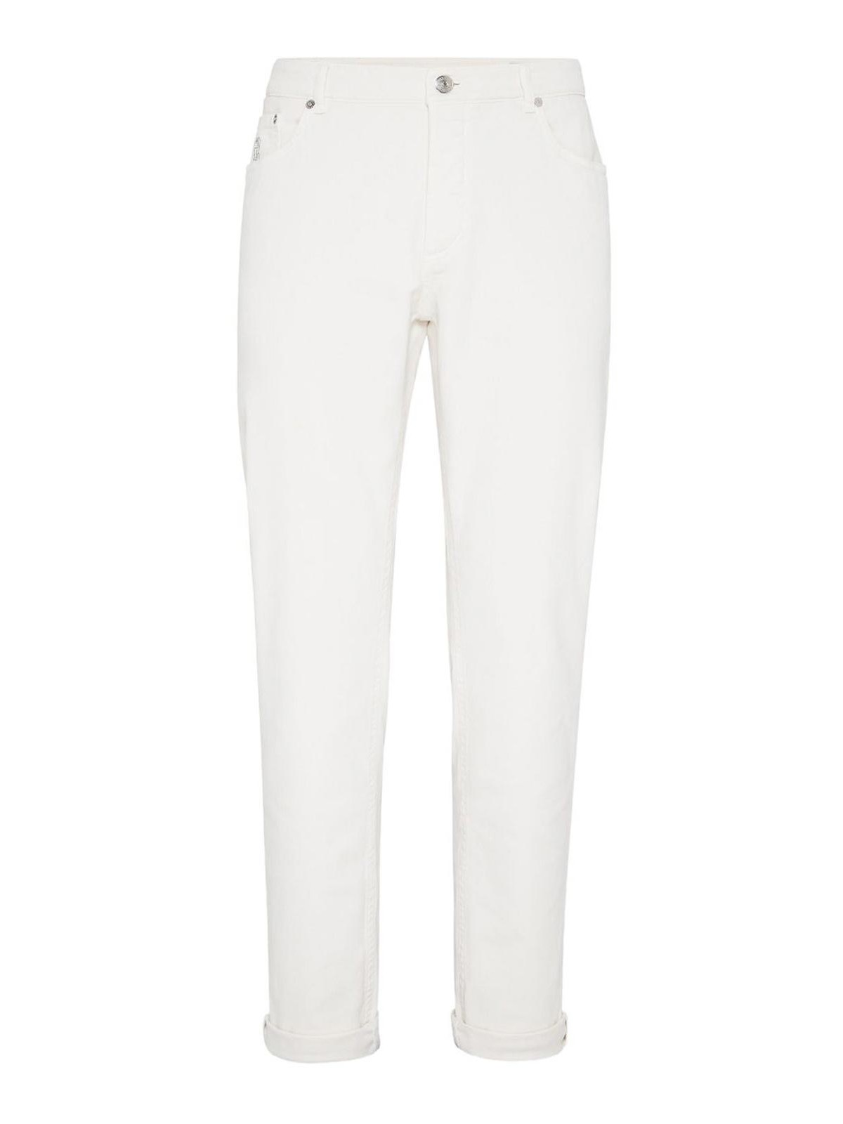 Traditional fit trousers in white lightweight denim by brunello cucinelli with five pockets the traditional fit is comfortable and stays close to the body along the entire leg to enhance the male physique, brunello cucinelli, traditional fit trousers, white