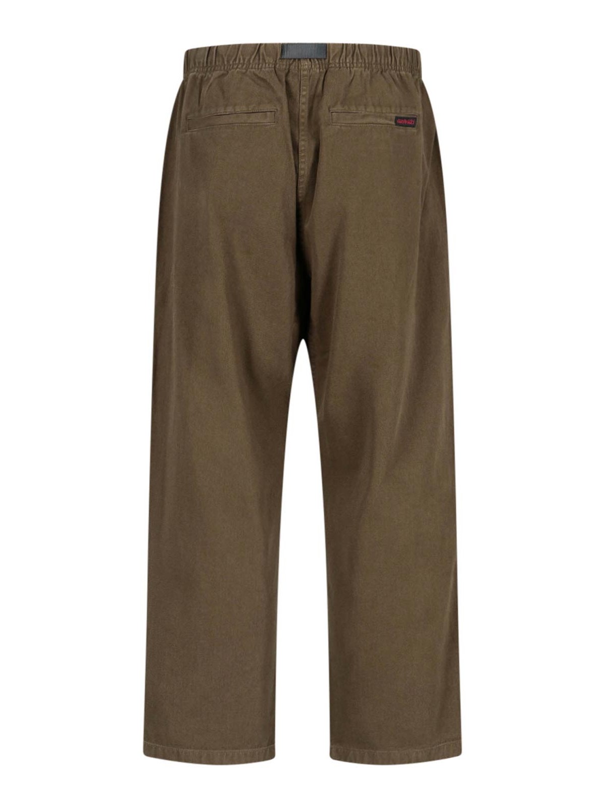 Gramicci loose tapered trousers low elastic waist black belt waist two side pockets two welt pockets back black logo label back straight leg