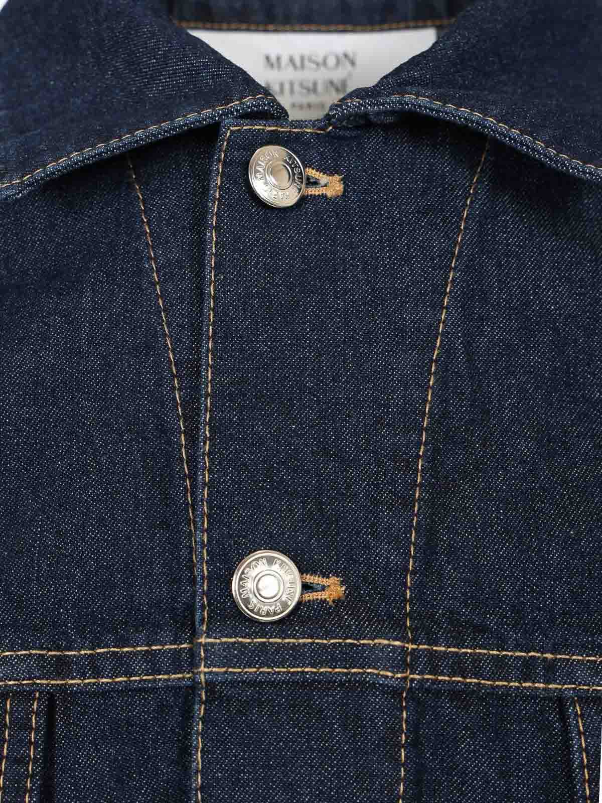 Japanese denim trucker jacket by maison kitsun, featuring contrast stitching, shirt collar, embossed metal button fastening, two buttoned flap pockets on the chest, long sleeves finished with straight buttoned cuffs, contrasting profile fox embroidery on the chest pocket, belt with buttoned tabs on the sides and maison kitsun embossed jacron on the back of the waist