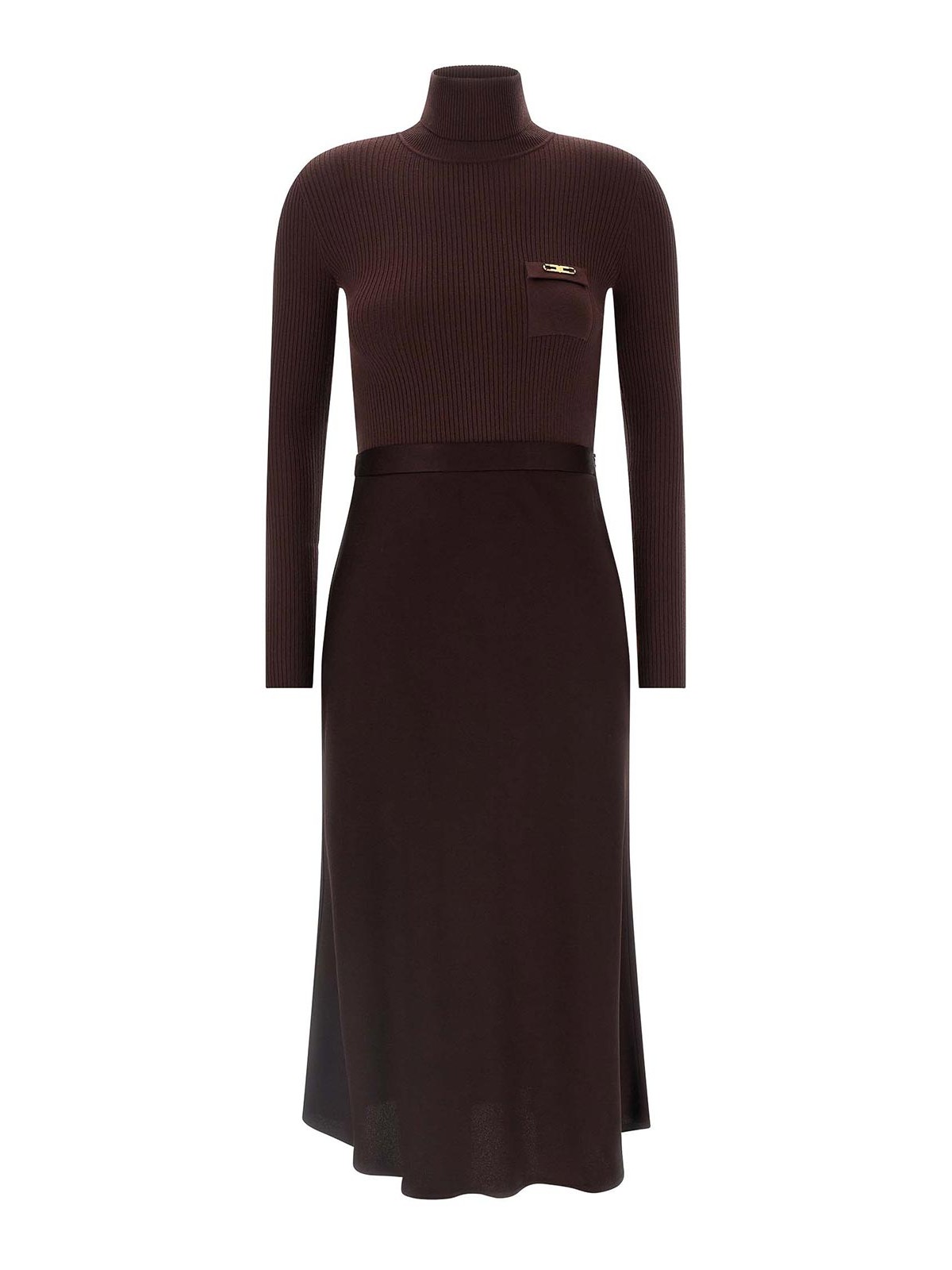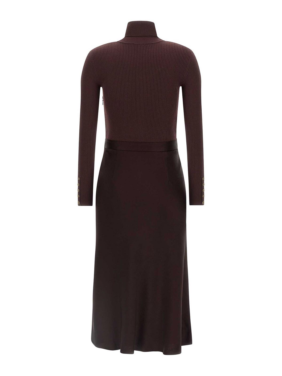 Midi dress consisting of ribbed stretch knit top, turtleneck turtleneck, pocket with gold metal logo, long sleeves and flared satin longuette skirt.