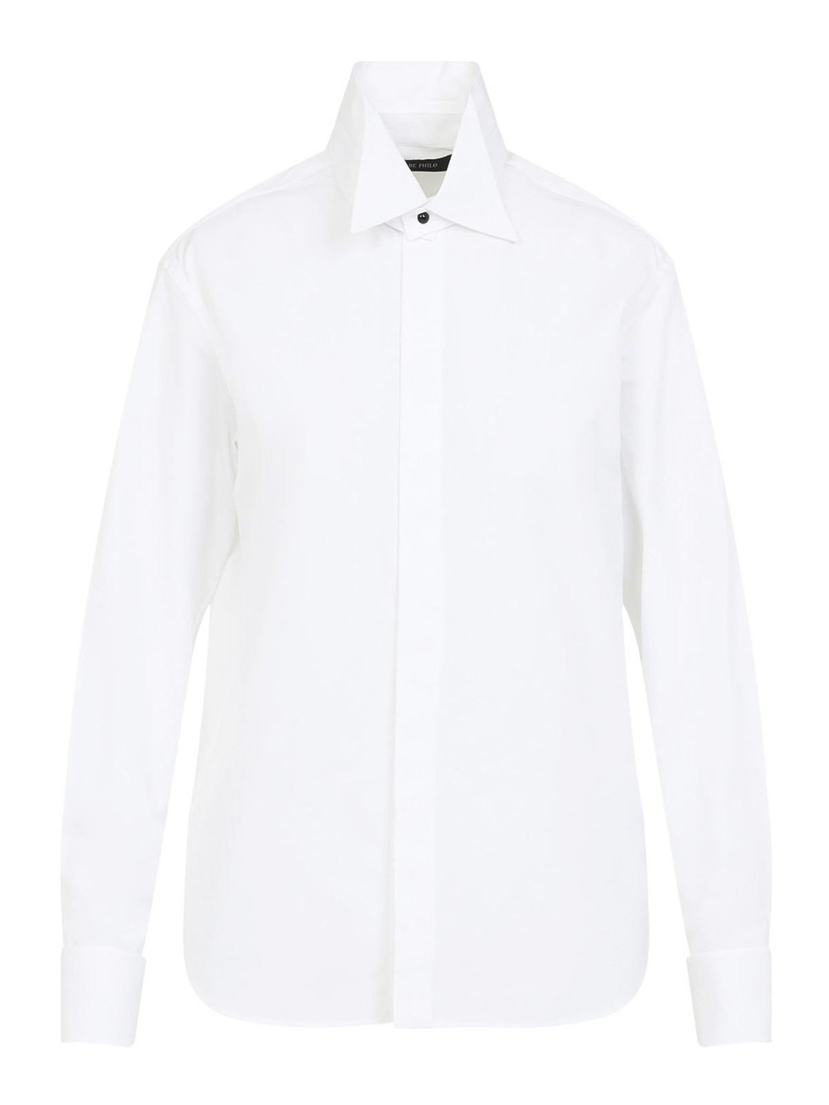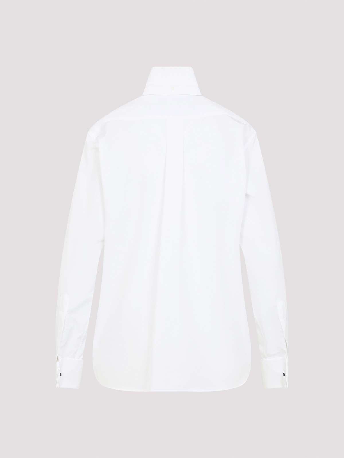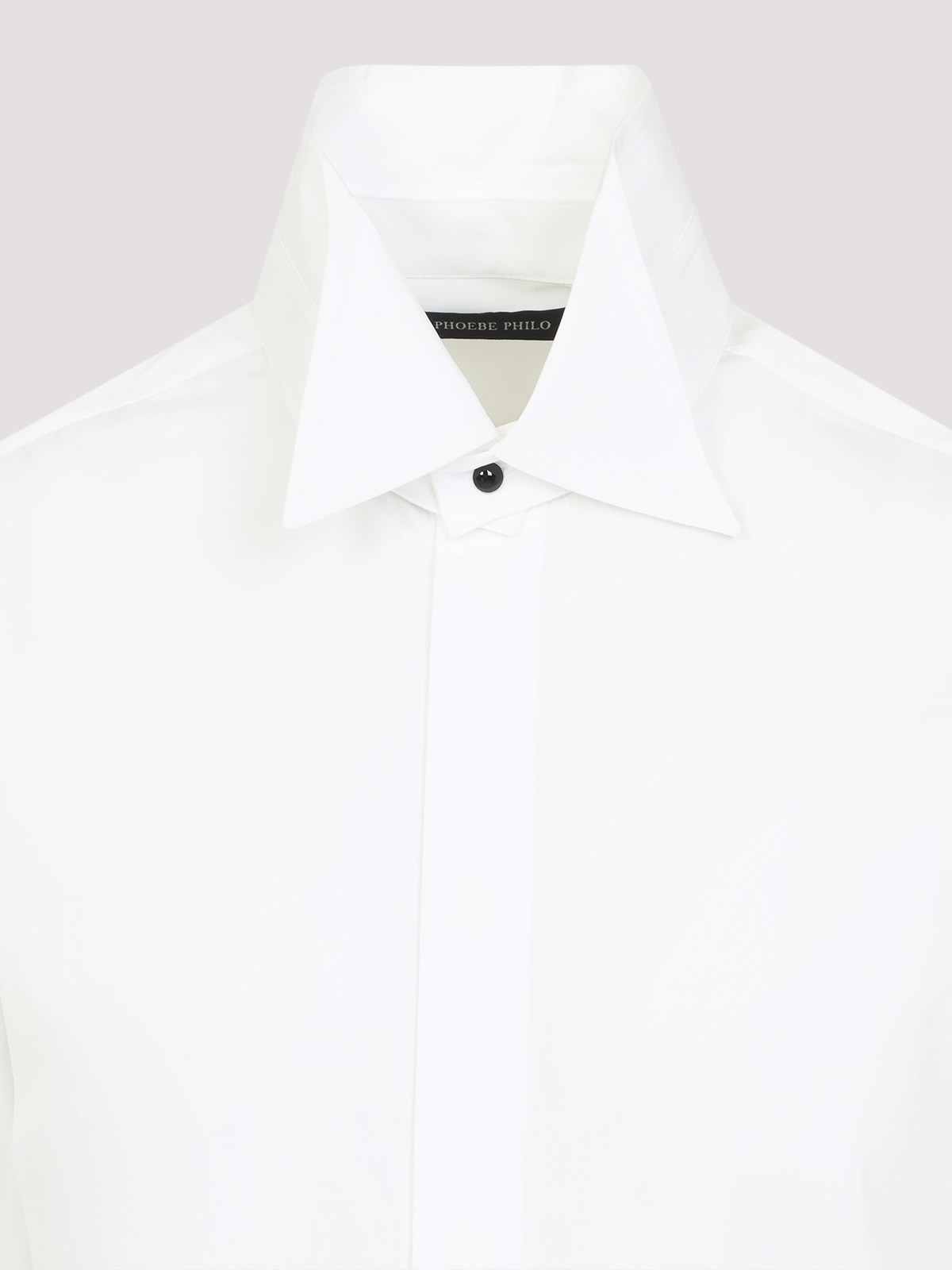 Phoebe philo tuxedo white shirt crafted from white poplin high neck and detachable collar concealed button long sleeves with double cuffs back yoke and box pleat rounded hem