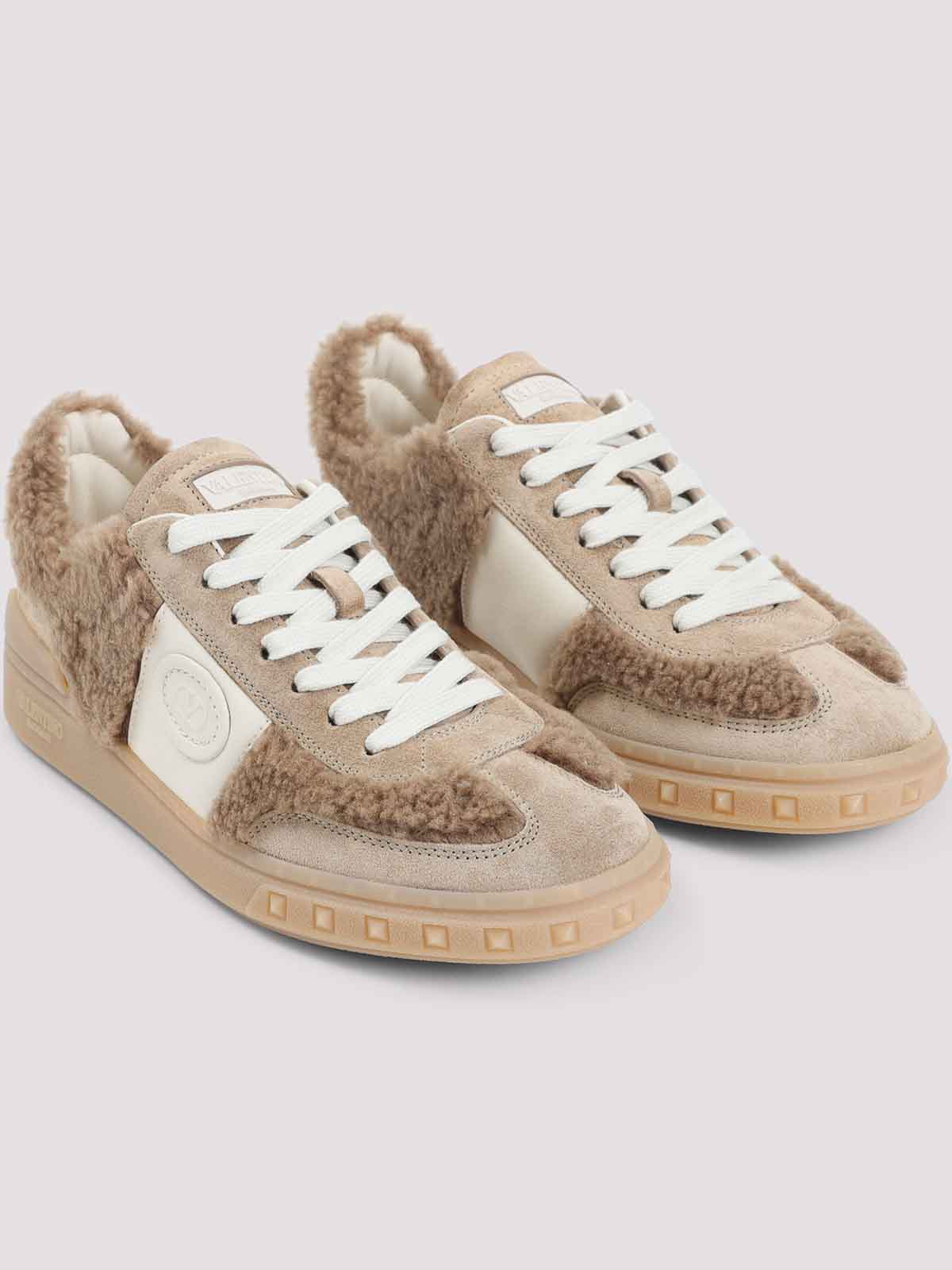 Valentino garavani brown upvillage sneakers brown sneakers round toe top contrasting white lace, up glace white patch logo on the tongue side glace white strap with embossed logo brown on the beige with studded