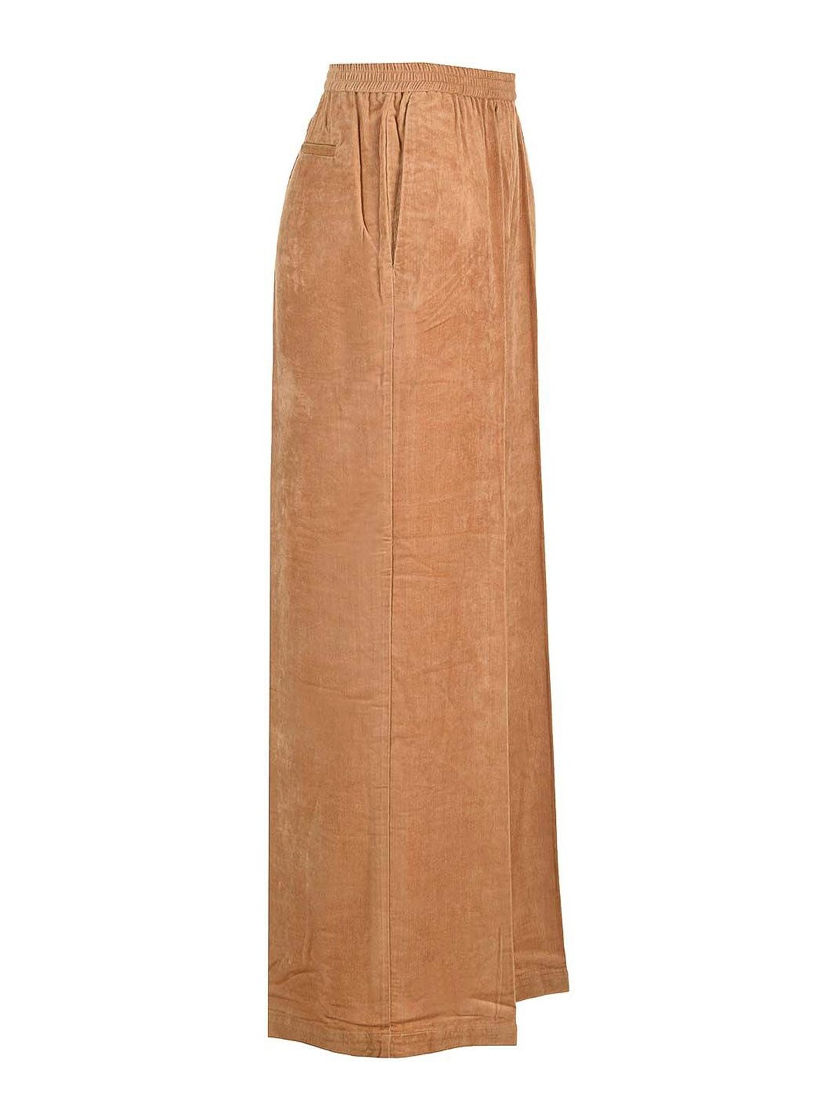 Matte caramel brown corduroy velvet wide leg pants from forte forte with comfortable elastic waist, vertical pockets, relaxed fit.