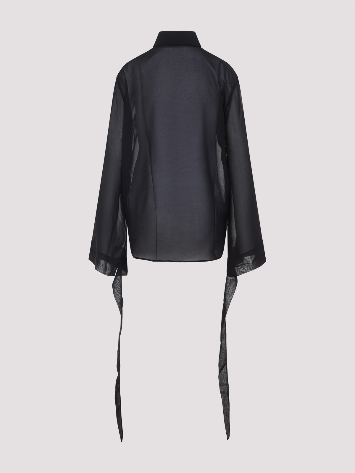 The frankie shop black verlin sheer chiffon tie cuff shirt. crafted in polyester fabric. pointed collar, front concealing buttoned fastening, dropped shoulders, long bell sleeves, tonal chiffon strap on the cuffs, straight hem, tonal stitching.