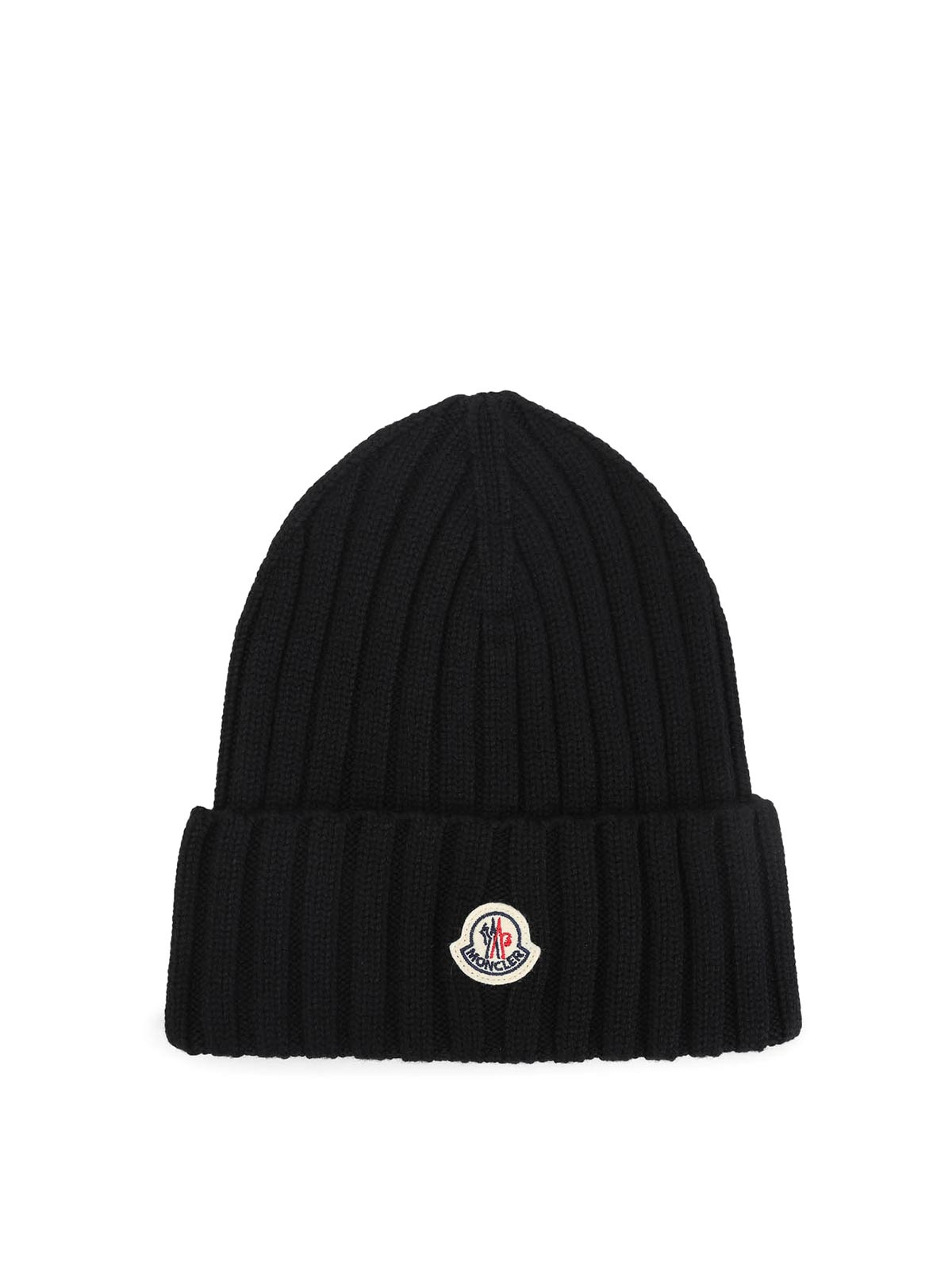 Moncler black virgin wool hat. crafted from ribbed black virgin wool, turn-up hem with a logo patch detail.