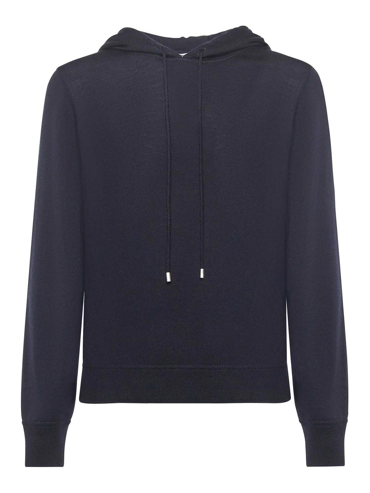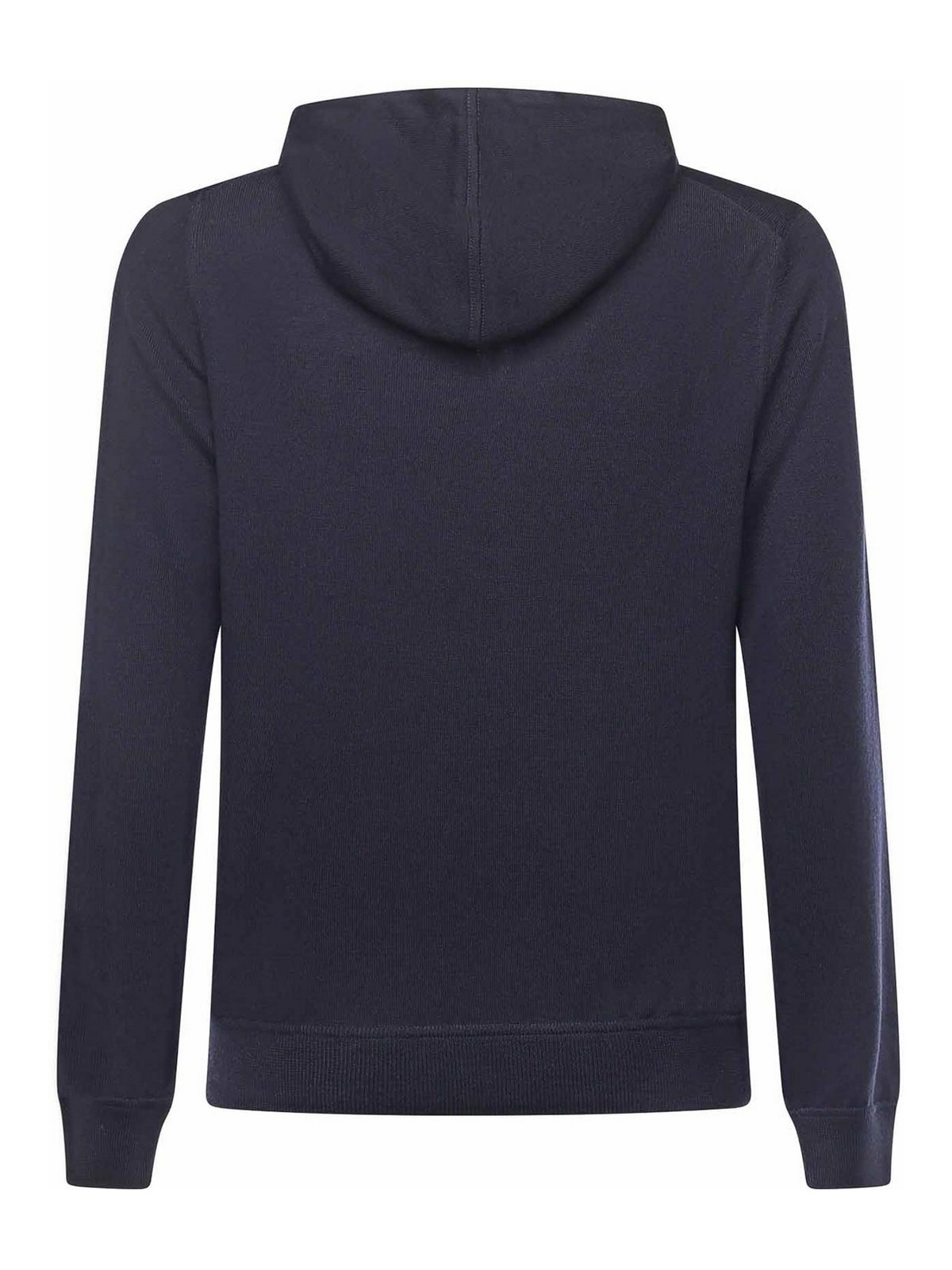 made of pure virgin wool, drawstring hood, long sleeves with ribbed cuffs, ribbed hem, size shown in photo is 48, made in italy, color: blue
