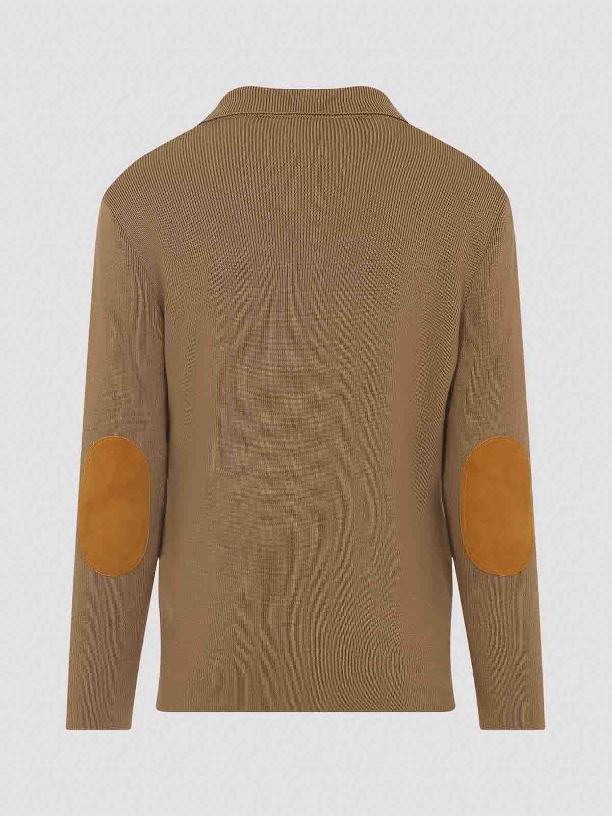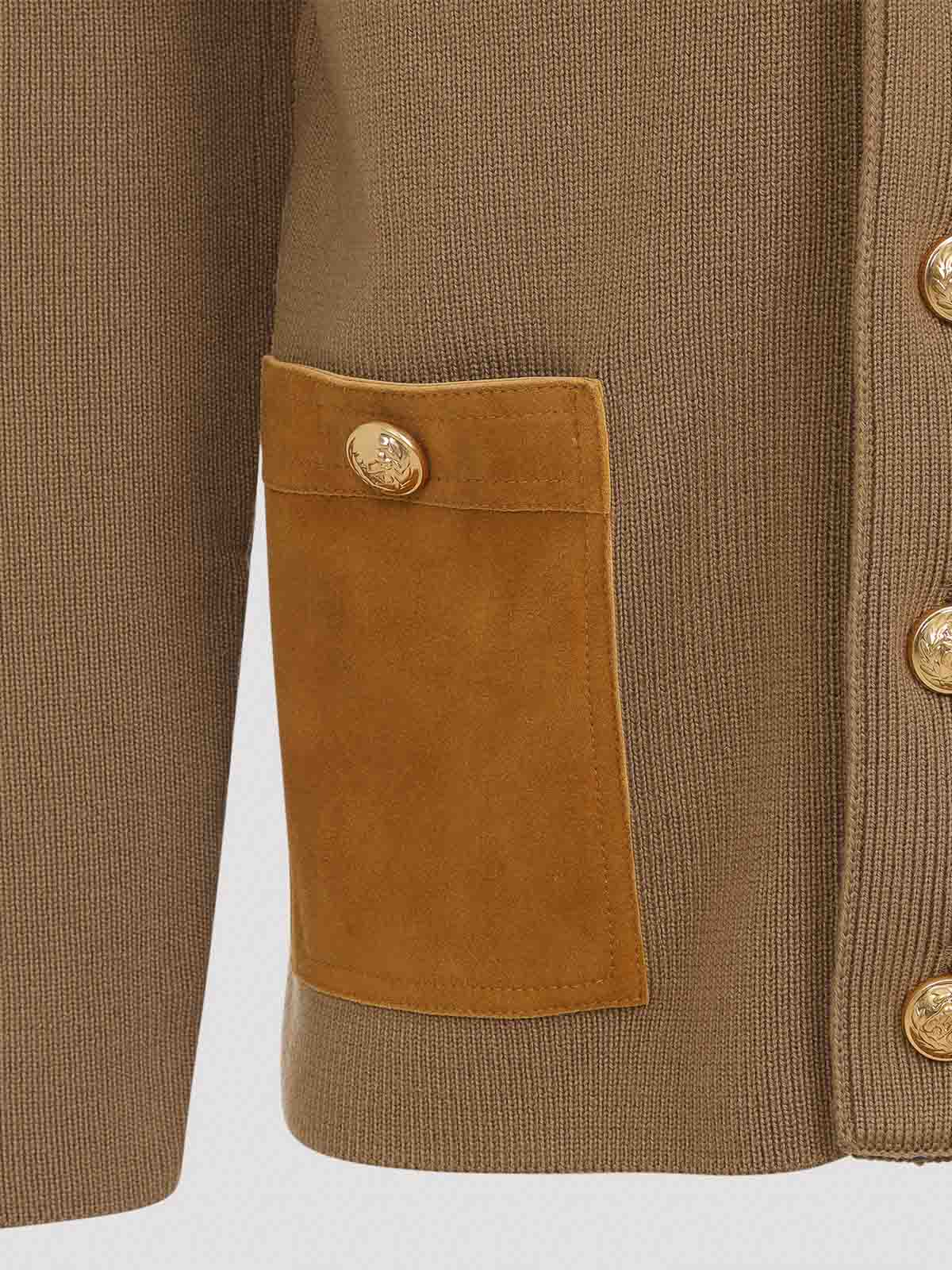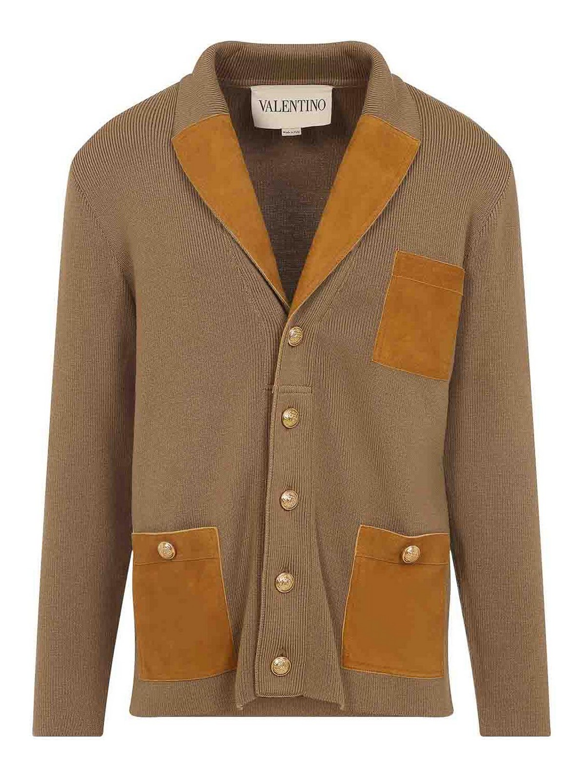 Valentino light brown virgin wool cardigan. crafted from light brown ribbed virgin wool, brown suede leather inserts and detailing, round lapels, front button fastening, one breast pocket and two buttoned patch pockets on the front, long sleeves with elbow patches, straight hem.