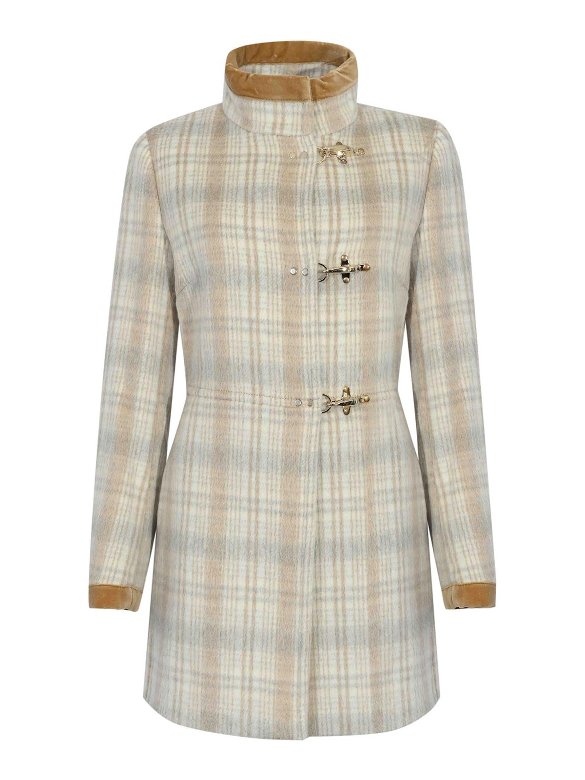 Virginia coat in melange cloth fay melange cloth with pattern checked in beige and cream tones sleeves long collar high neck with with hidden zip and three, tone fay hooks pockets side welt cuffs and collar tailored stitching fay logo on the hook lined yes fit regular and slightly fitted