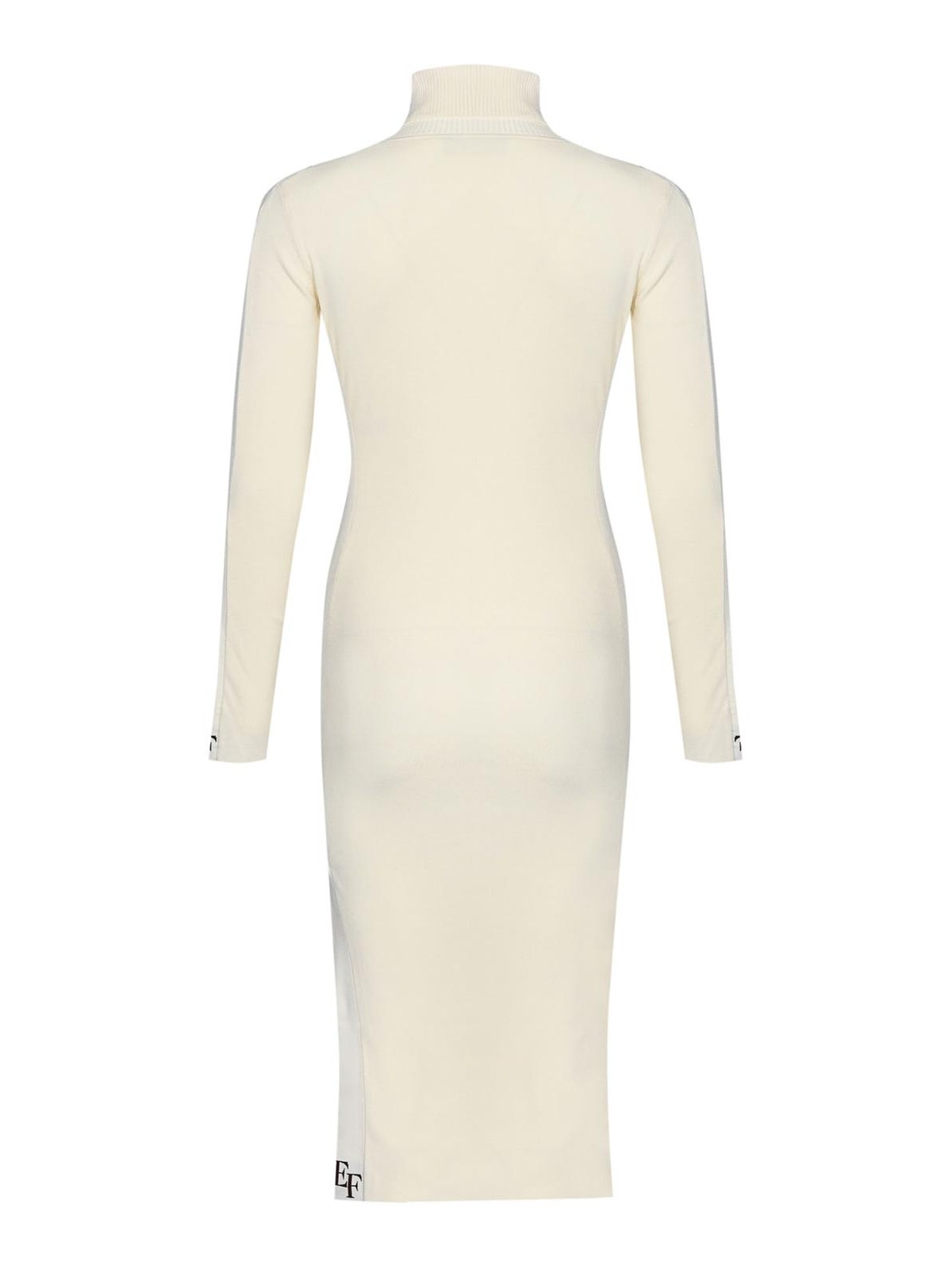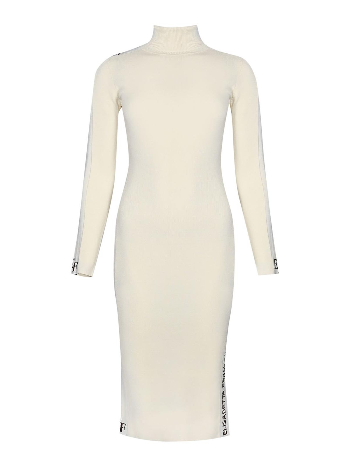 Shiny knit ribbed knit contrasting logo stripes high neck long sleeves side slit slim fit