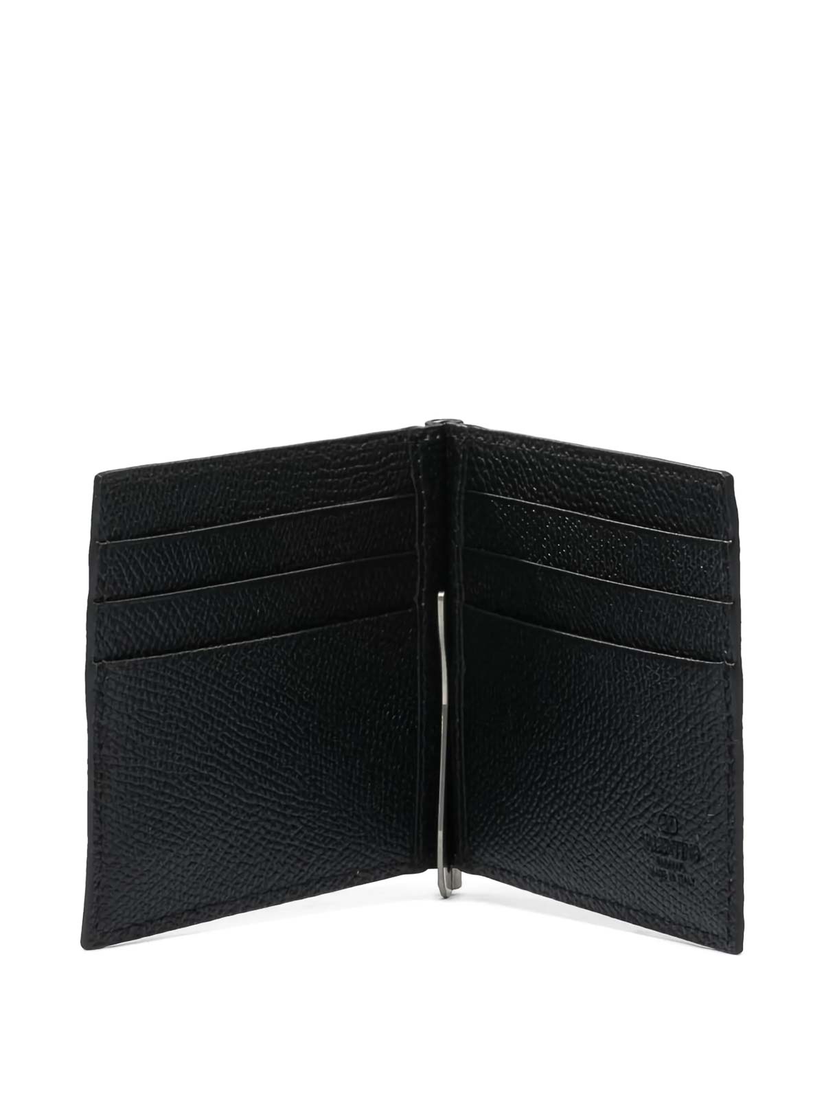 designer color: black, calf leather, grained texture, money clip, vlogo signature to the front, internal embossed logo, silver-tone hardware, multiple card slots.