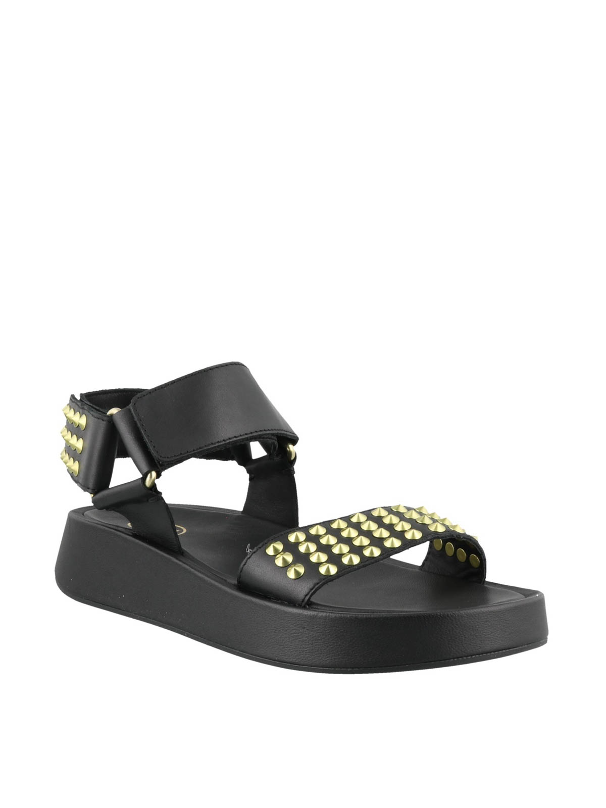Leather platform sandals featuring round studs and adjustable velcro strap.