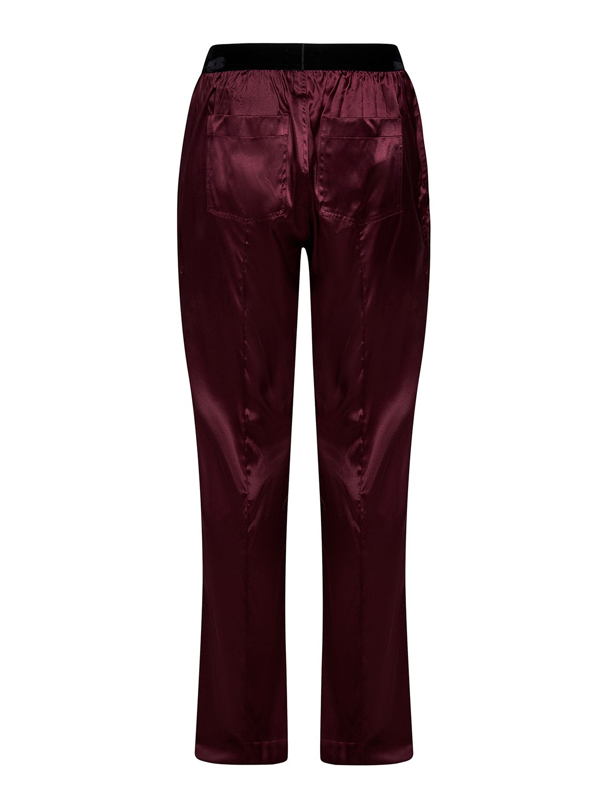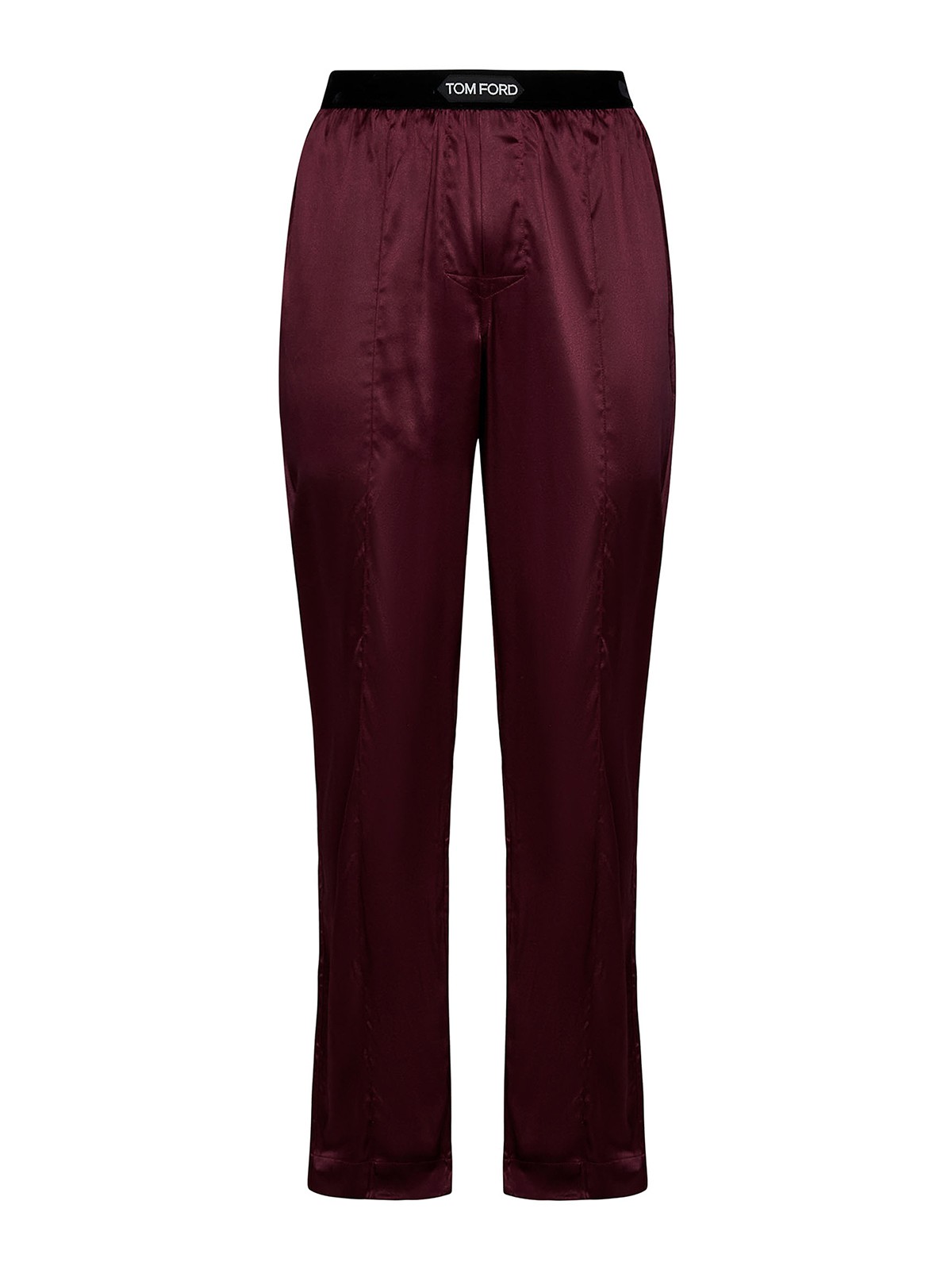 Black velvet elasticated waistband with contrasting jacquard tom ford logo patch at front side pockets back patch pockets stitched centre-front and centre-back creases straight leg wine silk 7% elastane item in photo corresponds to a m